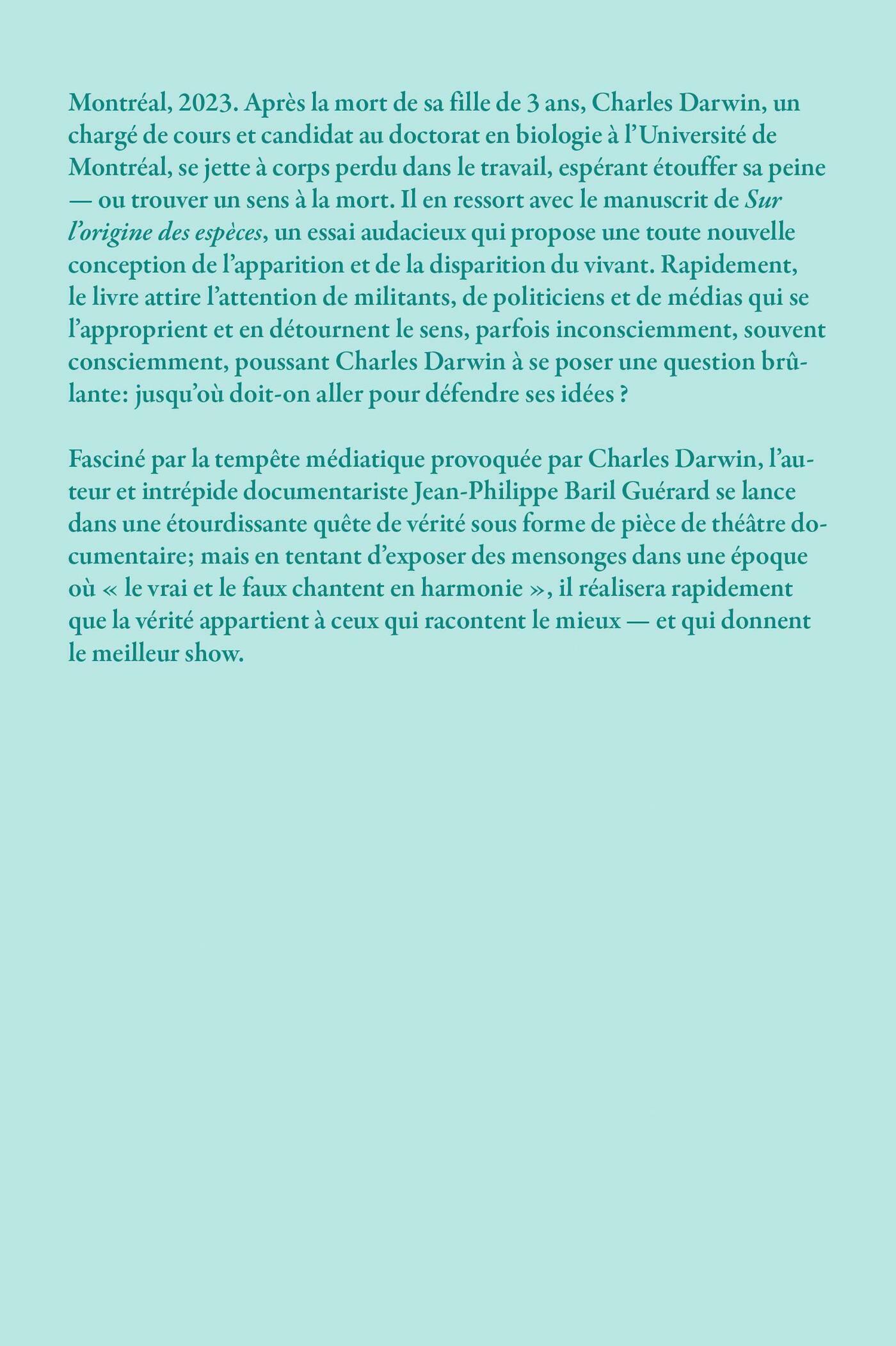 Montréal, 2023. Après la mort de sa fille de 3 ans, Charles Darwin, un chargé de cours et candidat au doctorat en biologie à l’Université de Montréal, se jette à corps perdu dans le travail, espérant étouffer sa peine — ou trouver un sens à la mort. Il en ressort avec le manuscrit de Sur l’origine des espèces, un essai audacieux qui propose une toute nouvelle conception de l’apparition et de la disparition du vivant. Rapidement, le livre attire l’attention de militants, de politiciens et de médias qui se l’approprient et en détournent le sens, parfois inconsciemment, souvent consciemment, poussant Charles Darwin à se poser une question brûlante: jusqu’où doit-on aller pour défendre ses idées?