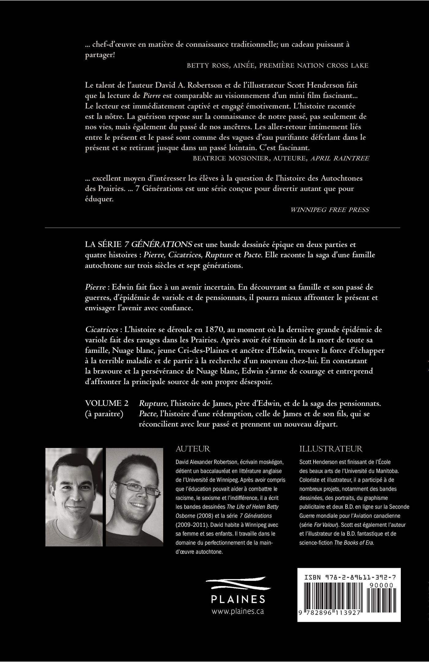 LA SÉRIE 7 GÉNÉRATIONS est une bande dessinée épique en deux volumes et quatre histoires : Pierre, Cicatrices, Rupture et Pacte. Elle raconte la saga d’une famille autochtone sur trois siècles et sept générations.VOLUME 1 :Pierre : Edwin fait face à un avenir incertain. En découvrant sa famille et son passé de guerres, d’épidémie de variole et de pensionnats, il pourra mieux affronter le présent et envisager l’avenir avec confiance.Cicatrices : L’histoire se déroule en 1870, au moment où la dernière grande épidémie de variole fait des ravages dans les Prairies. Après avoir été témoin de la mort de toute sa famille, Nuage blanc, jeune Cri-des-Plaines et ancêtre d’Edwin, trouve la force d’échapper à la terrible maladie et de partir à la recherche d’un nouveau chez-lui. En constatant la bravoure et la persévérance de Nuage blanc, Edwin s’arme de courage et entreprend d’affronter la principale source de son propre désespoir.VOLUME 2 :Rupture, l’histoire de James, père d’Edwin, et de la saga des pensionnats.Pacte, l’histoire d’une rédemption, celle de James et de son fils, qui se réconcilient avec leur passé et prennent un nouveau départ.