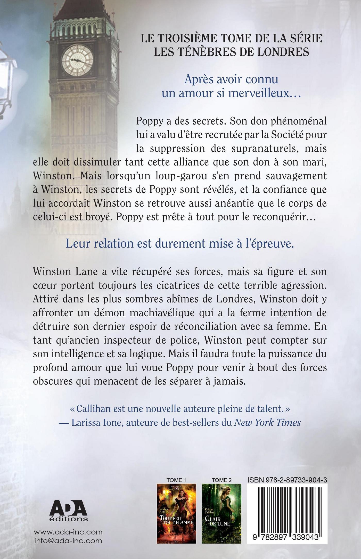 Après avoir connu un amour si merveilleux…Poppy a des secrets. Son don phénoménal lui a valu d’être recrutée par la Société pour la suppression des supranaturels, mais elle doit cependant dissimuler tant cette alliance que son don à son mari, Winston. Mais lorsqu’un loup-garou s’en prend sauvagement à Winston, les secrets de Poppy sont révélés, et la confiance que lui accordait Winston se retrouve aussi anéantie que le corps de celui-ci est broyé. Poppy est prête à tout pour le reconquérir… Leur relation est durement mise à l’épreuve. Winston Lane a vite récupéré ses forces, mais sa figure et son coeur portent toujours les cicatrices de cette terrible agression. Attiré dans les plus sombres abîmes de Londres, Winston doit y affronter un démon machiavélique qui a la ferme intention de détruire son dernier espoir de réconciliation avec sa femme. En tant qu’ancien inspecteur de police, Winston peut compter sur son intelligence et sa logique. Mais il faudra toute la puissance du profond amour que lui voue Poppy pour venir à bout des forces obscures qui menacent de les séparer à jamais.