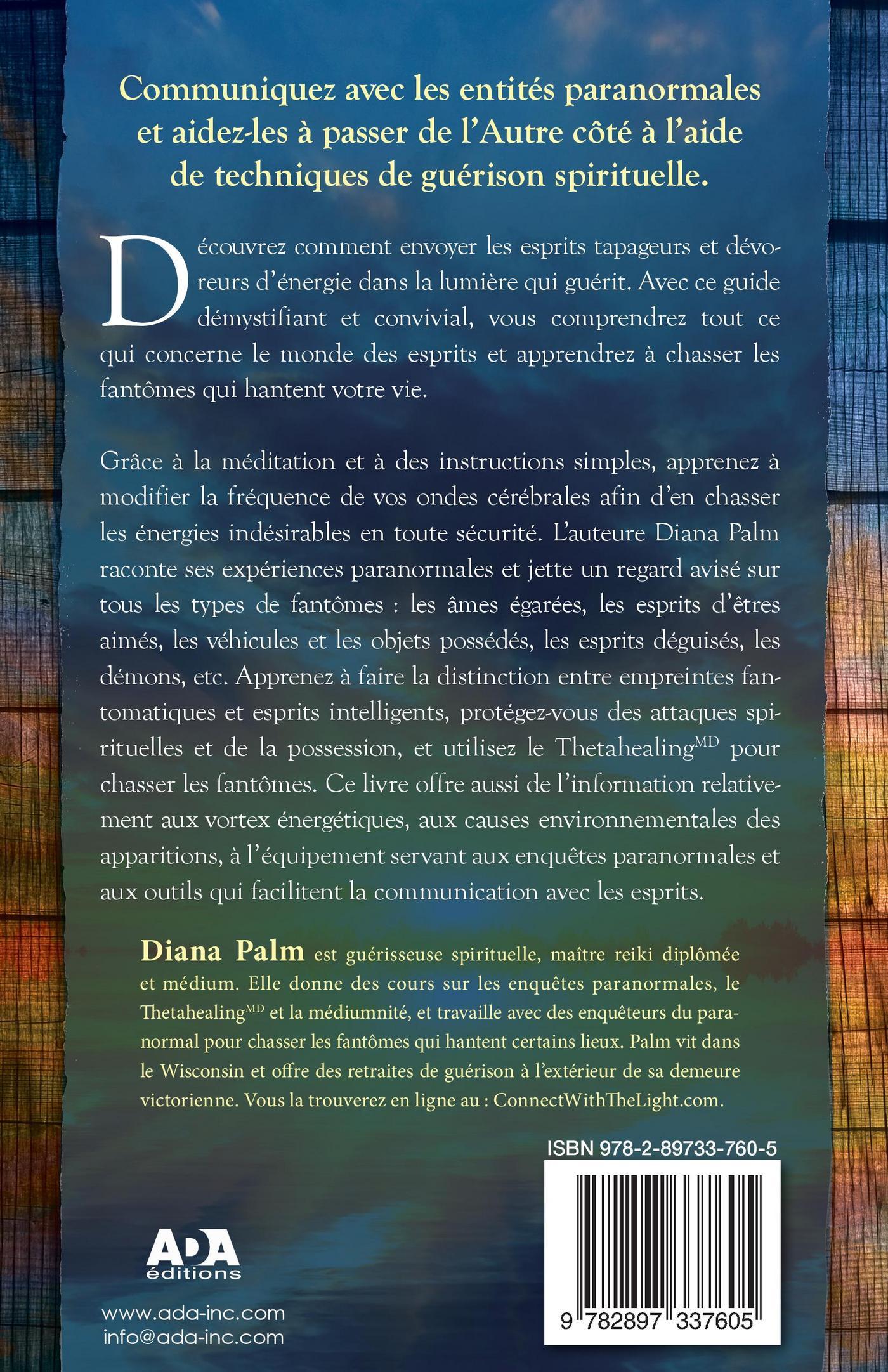 Découvrez comment envoyer les esprits tapageurs et dévoreurs d’énergie dans la lumière qui guérit. Avec ce guide démystifiant et convivial, vous comprendrez tout ce qui concerne le monde des esprits, et apprendrez à chasser les fantômes qui hantent votre vie. Grâce à la méditation et à des instructions simples, apprenez à modifier la fréquence de vos ondes cérébrales afin d’en chasser les énergies indésirables en toute sécurité. L’auteure Diana Palm raconte ses expériences paranormales et jette un regard avisé sur tous les types de fantômes: âmes égarées, êtres aimés en esprit, véhicules et objets possédés, esprits déguisés, démons, etc. Apprenez à faire la distinction entre empreintes fantomatiques et esprits intelligents, protégez-vous des attaques spirituelles et de la possession, et utilisez la Guérison Thêta pour chasser les fantômes. Ce livre offre aussi de l’information relativement aux vortex énergétiques, aux causes environnementales des apparitions, à l’équipement servant aux enquêtes paranormales et aux outils qui facilitent la communication avec les esprits.