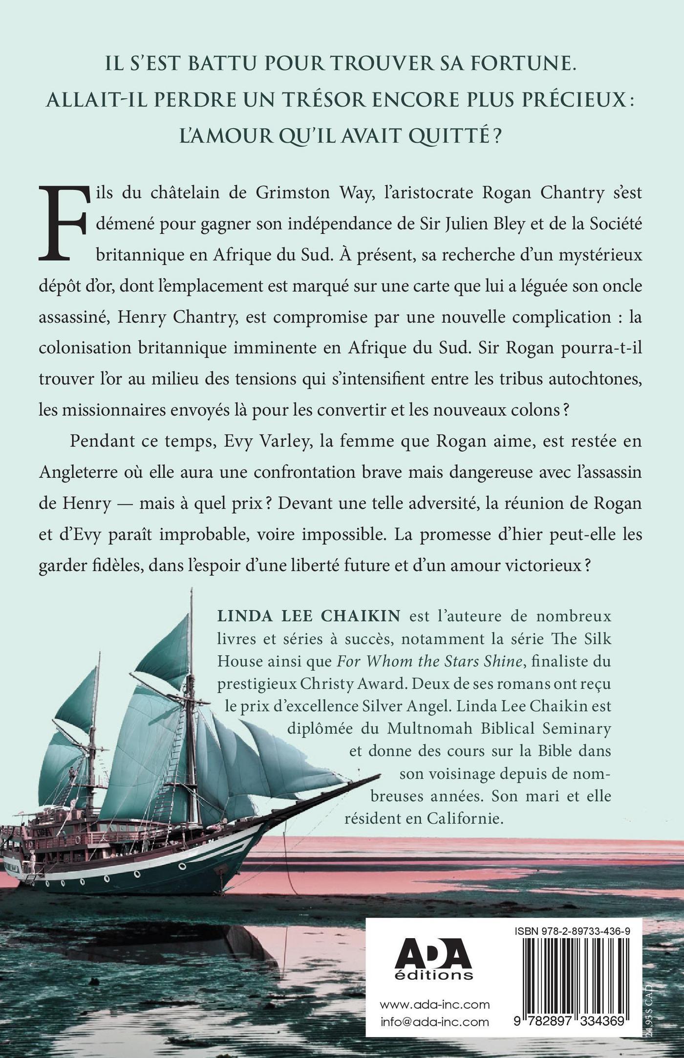 Fils du châtelain de Grimston Way, l’aristocrate Rogan Chantry s’est démené pour gagner son indépendance de Sir Julien Bley et de la Société britannique en Afrique du Sud. À présent, sa recherche d’un mystérieux dépôt d’or, dont l’emplacement est marqué sur une carte que lui a légué son oncle assassiné, Henry Chantry, est frustrée par une nouvelle complication: la colonisation britannique imminente en Afrique du Sud. Sir Rogan pourra-t-il trouver l’or au milieu des tensions qui s’intensifient entre les tribus autochtones, les missionnaires envoyés là pour les convertir et les nouveaux colons? Pendant ce temps, Evy Varley, la femme que Rogan aime, est restée en Angleterre où elle aura une confrontation brave, mais dangereuse avec l’assassin de Henry – mais à quel prix? Devant une telle adversité, la réunion de Rogan et d’Evy paraît improbable, voire impossible. La promesse d’hier peut-elle les garder fidèles, dans l’espoir d’une liberté future et d’un amour victorieux?