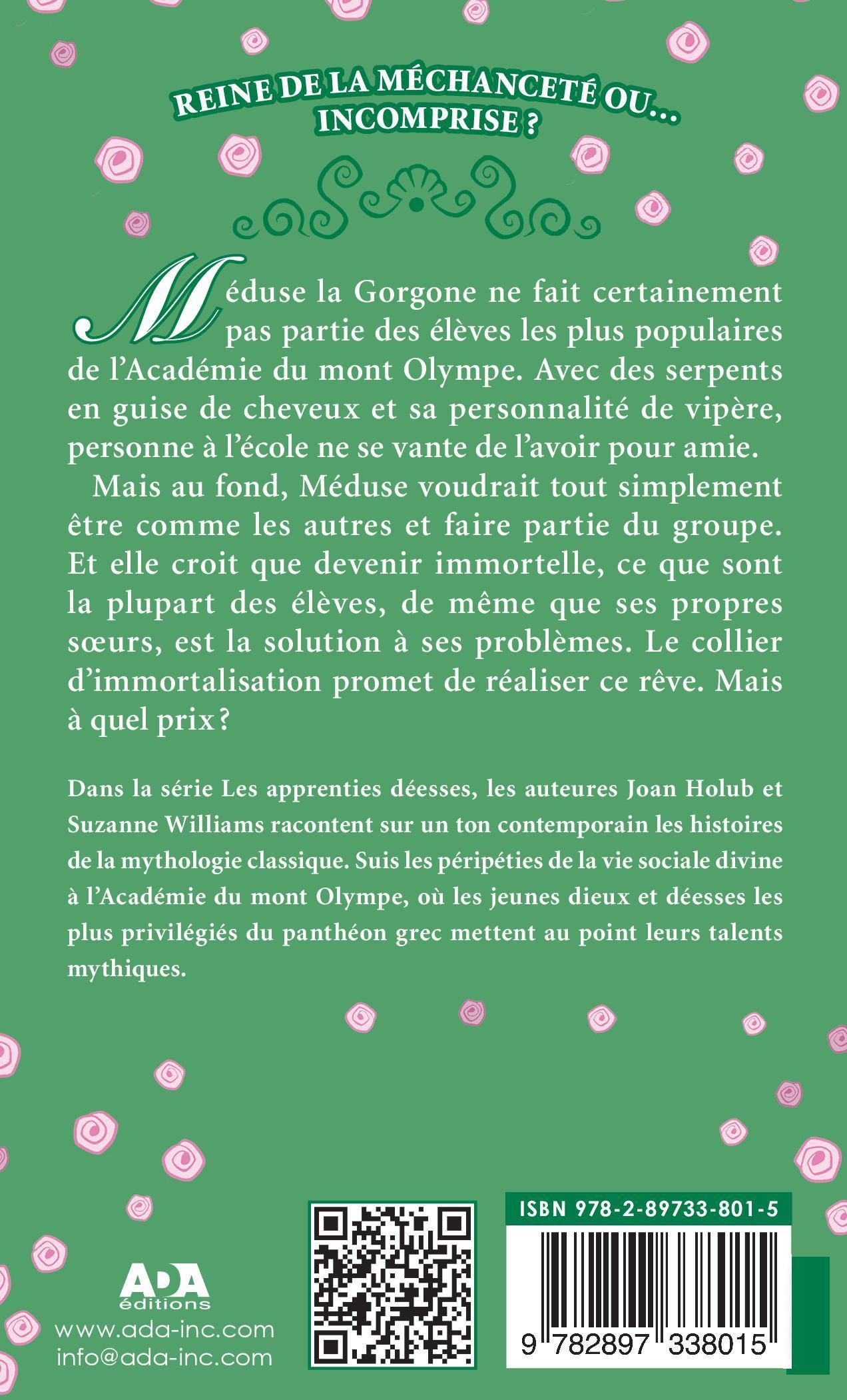 Méduse la Gorgone ne fait certainement pas partie des élèves les plus populaires de l’Académie du mont Olympe. Avec des serpents en guise de cheveux et sa personnalité de vipère, personne à l’école ne se vante de l’avoir pour amie. Mais au fond, Méduse voudrait tout simplement être comme les autres et faire partie du groupe. Et elle croit que devenir immortelle, ce que sont la plupart des élèves, de même que ses propres soeurs, est la solution à ses problèmes. Le collier d’immortalisation promet de réaliser ce rêve. Mais à quel prix? Dans la série Les apprenties déesses, les auteures Joan Holub et Suzanne Williamsracontent sur un ton contemporain les histoires de la mythologie classique. Suisles péripéties de la vie sociale divine à l’Académie du mont Olympe, où les jeunesdieux et déesses les plus privilégiés du panthéon grec mettent au point leurstalents mythiques.