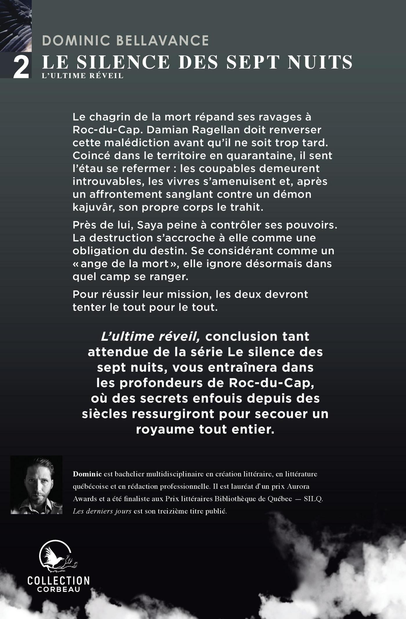 L’ultime réveil, conclusion tant attendue de la série Le silence des sept nuits, vous entraînera dans les profondeurs de Roc-du-Cap, où des secrets enfouis depuis des siècles ressurgiront pour secouer un royaume tout entier.Le chagrin de la mort répand ses ravages à Roc-du-Cap. Damian Ragellan doit renverser cette malédiction avant qu’il ne soit trop tard. Coincé dans le territoire en quarantaine, il sent l’étau se refermer: les coupables demeurent introuvables, les vivres s’amenuisent et, après un affrontement sanglant contre un démon kajuvâr, son propre corps le trahit.Près de lui, Saya peine à contrôler ses pouvoirs. La destruction s’accroche à elle comme une obligation du destin. Se considérant comme un «ange de la mort», elle ignore désormais dans quel camp se ranger.Pour réussir leur mission, les deux devront tenter le tout pour le tout.