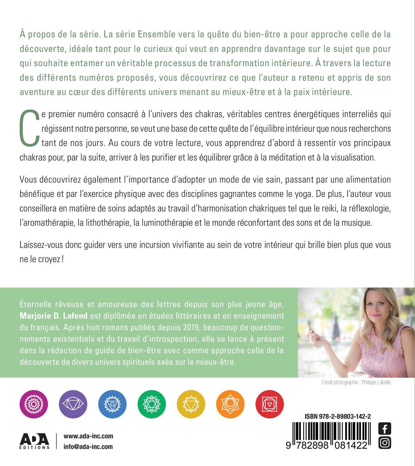 À propos de la série. La série Ensemble vers la quête du bien-être a pour approche celle de la découverte, idéale tant pour le curieux qui veut en apprendre davantage sur le sujet que pour qui souhaite entamer un véritable processus de transformation intérieure. À travers la lecture des différents numéros proposés, vous découvrirez ce que l’auteur a retenu et appris de son aventure au coeur des différents univers menant au mieux-être et à la paix intérieure.Ce premier numéro consacré à l’univers des chakras, véritables centres énergétiques interreliés qui régissent notre personne, se veut une base de cette quête de l’équilibre intérieur que nous recherchons tant de nos jours. Au cours de votre lecture, vous apprendrez d’abord à ressentir vos principaux chakras pour, par la suite, arriver à les purifier et les équilibrer grâce à la méditation et à la visualisation.Vous découvrirez également l’importance d’adopter un mode de vie sain, passant par une alimentation bénéfique et par l’exercice physique avec des disciplines gagnantes comme le yoga. De plus, l’auteur vous conseillera en matière de soins adaptés au travail d’harmonisation chakriques tel que le reiki, la réflexologie, l’aromathérapie, la lithothérapie, la luminothérapie et le monde réconfortant des sons et de la musique.Laissez-vous donc guider vers une incursion vivifiante au sein de votre intérieur qui brille bien plus que vous ne le croyez!