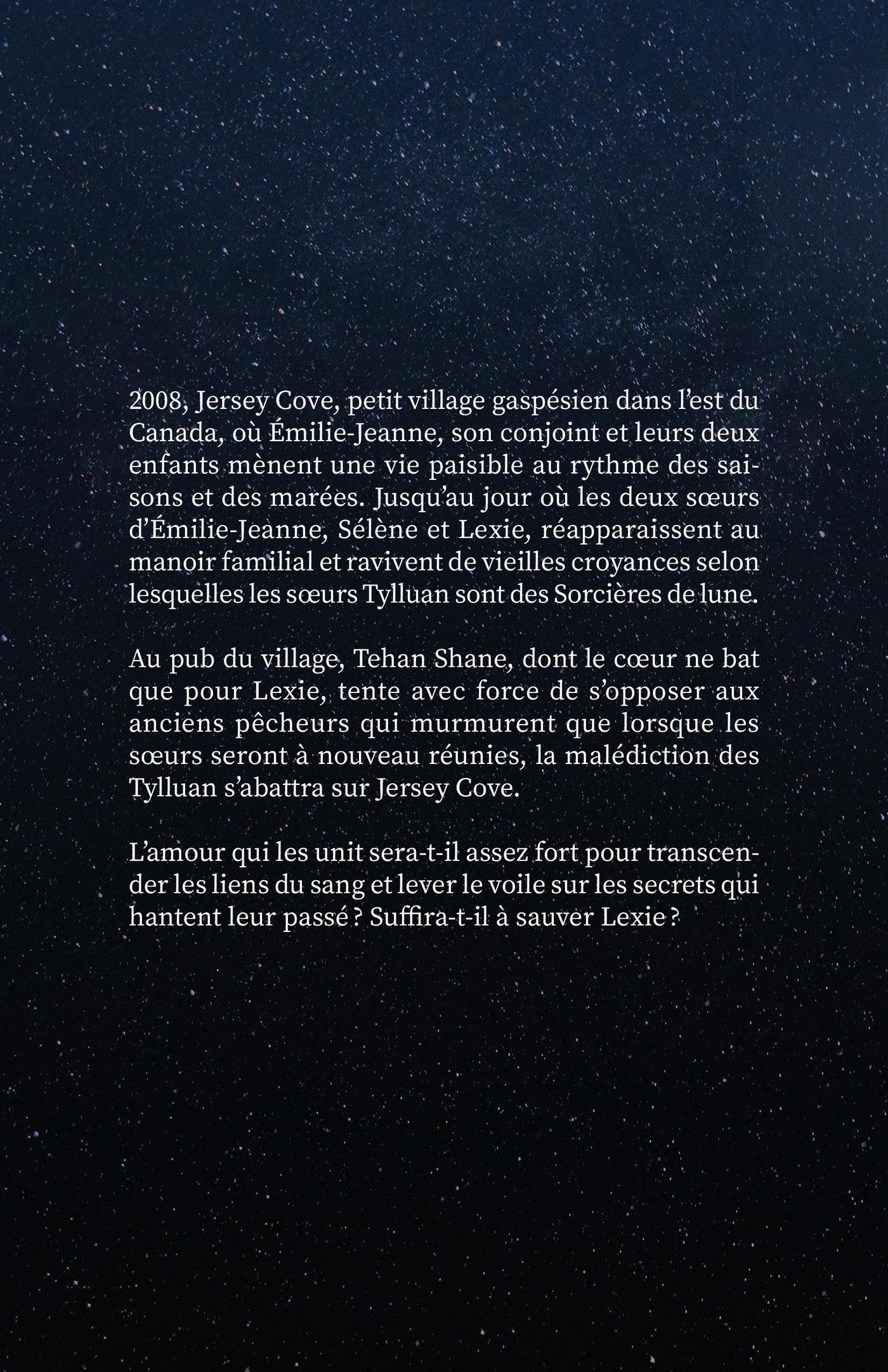 2008, Jersey Cove, petit village gaspésien dans l’est du Canada, où Émilie-Jeanne, son conjoint et leurs deux enfants mènent une vie paisible au rythme des saisons et des marées. Jusqu’au jour où les deux soeursd’Émilie-Jeanne : Sélène et Lexie, réapparaissent au manoir familial et ravivent de vieilles croyances selon lesquelles les soeurs Tylluan sont des Sorcières de lune.Au pub du village, Tehan Shane dont le coeur ne bat plus que pour Lexie, tente avec force de s’opposer aux anciens pêcheurs qui murmurent que lorsque les soeurs seront à nouveau réunies, la malédiction des Tylluan s’abattra sur Jersey Cove.L’amour qui les unit sera-t-il assez fort pour transcender les liens du sang et lever le voile sur les secrets qui hantent leur passé ? Suffira-t-il à sauver Lexie?