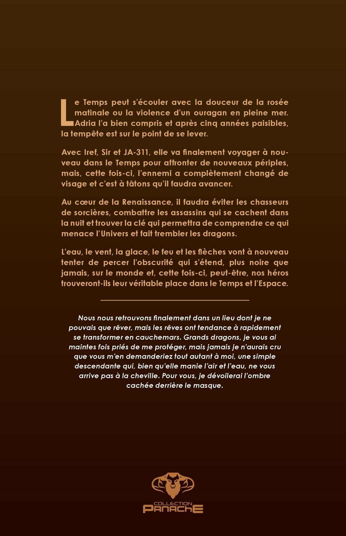 Le Temps peut s'écouler avec la douceur de la rosée matinale ou la violence d'un ouragan en pleine mer. Adria l'a bien compris et après cinq années paisibles, la tempête est sur le point de se lever. Avec Iref, Sir et JA-311, elle va finalement voyager à nouveau dans le Temps pour affronter de nouveaux périples, mais, cette fois-ci, l'ennemi a complètement changé de visage et c'est à tâtons qu'il faudra avancer. Au coeur de la Renaissance, il faudra éviter les chasseurs de sorcières, combattre les assassins qui se cachent dans la nuit et trouver la clé qui permettra de comprendre ce qui menace l'univers et fait trembler les dragons. L'eau, le vent, la glace, le feu et les flèches vont à nouveau tenter de percer l'obscurité qui s'étend, plus noire que jamais, sur le monde et, cette fois-ci, peut-être, nos héros trouveront ils leur véritable place dans le Temps et l'Espace.