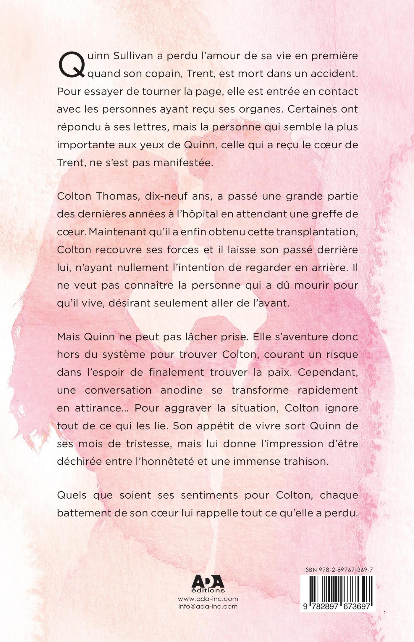 Quinn Sullivan a perdu l’amour de sa vie en première quand son copain Trent est mort dans un accident. Pour essayer de tourner la page, elle est entrée en contact avec les personnes ayant reçu ses organes. Certaines ont répondu à ses lettres, mais la personne qui semble la plus importante aux yeux de Quinn, celle qui a reçu le cœur de Trent, ne s’est pas manifestée.Colton Thomas, dix-neuf ans, a passé une grande partie des dernières années à l’hôpital en attendant une greffe de cœur. Maintenant qu’il a enfin obtenu cette transplantation, Colton recouvre ses forces et il laisse son passé derrière lui, n’ayant nullement l’intention de regarder en arrière. Il ne veut pas connaître la personne qui a dû mourir pour qu’il vive, désirant seulement aller de l’avant.Mais Quinn ne peut pas lâcher prise. Elle s’aventure donc hors du système pour trouver Colton, courant un risque dans l’espoir de finalement trouver la paix. Cependant, une conversation anodine se transforme rapidement en attirance... Pour aggraver la situation, Colton ignore tout de ce qui les lie. Son appétit de vivre sort Quinn de ses mois de tristesse, mais lui donne l’impression d’être déchirée entre l’honnêteté et une immense trahison.Quels que soient ses sentiments pour Colton, chaque battement de son cœur lui rappelle tout ce qu’elle a perdu.