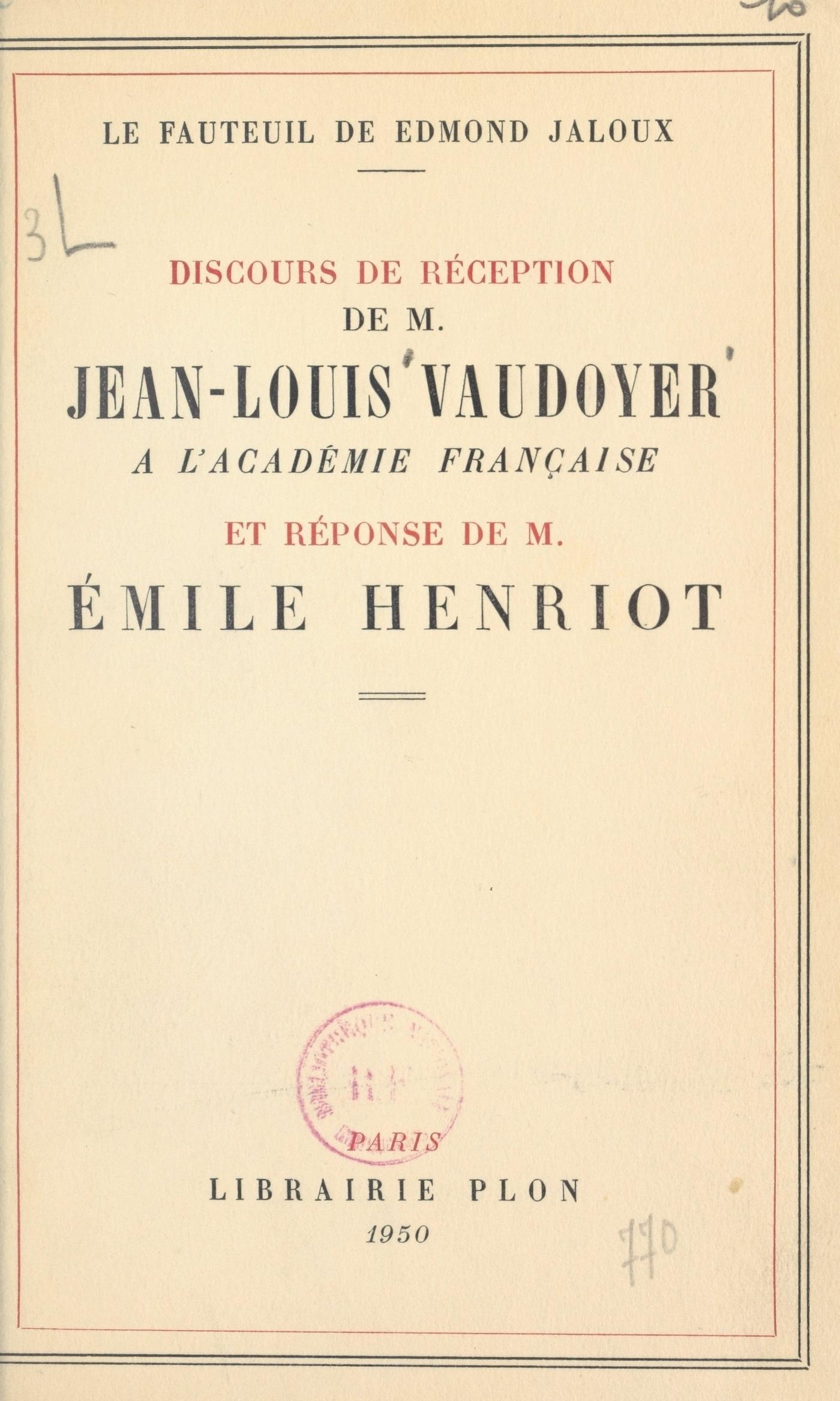 Le fauteuil de Edmond Jaloux : discours de réception de M. Jean-Louis Vaudoyer, prononcé le 22 juin 1950, à l'Académie française et réponse de M. Émile Henriot