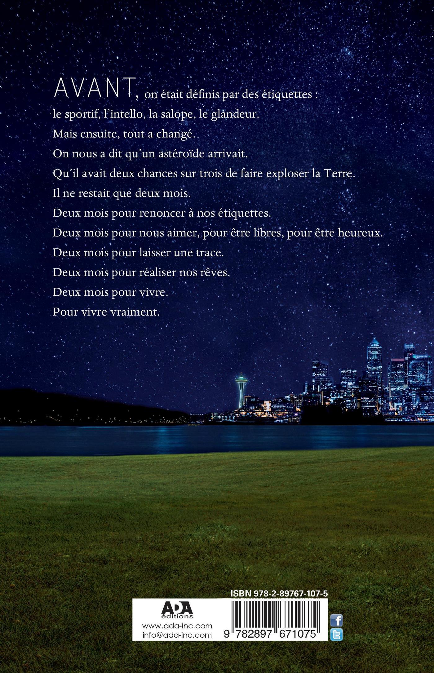 Un roman qui pose une question essentielle et fascinante : qu’est-ce que je ferais s’il ne restait que deux mois à vivre sur Terre ? De magnifques parcours d’adolescents, qui affrontent leur avenir, leurs rêves, leurs peurs, avec le besoin impérieux d’avoir choisi et vécu la vie qu’ils voulaient. Des personnages criants de vérité, à la fois tendres, ironiques et peu politiquement corrects, qui toucheront les lecteurs. Une narration efficace et originale : on suit tour à tour le point de vue d’un des quatre personnages principaux.La fin de la terminale approche. Pour Peter (le sportif populaire), Anita (l’élève parfaite), Andy (le looser), et Eliza (l’artiste à la mauvaise réputation) c’est le moment de faire des choix. Et chacun se demande s’il fait vraiment les bons. D’autant que la pression des profs, des parents, des amis est énorme… Jusqu’à ce qu’une météorite apparaisse dans le ciel : elle a deux chances sur trois de percuter et faire exploser la Terre deux mois plus tard. Tout à coup, l’avenir n’a plus la même importance… Peter, Anita, Andy et Eliza doivent décider maintenant ce qu’ils feront du reste de leur vie.