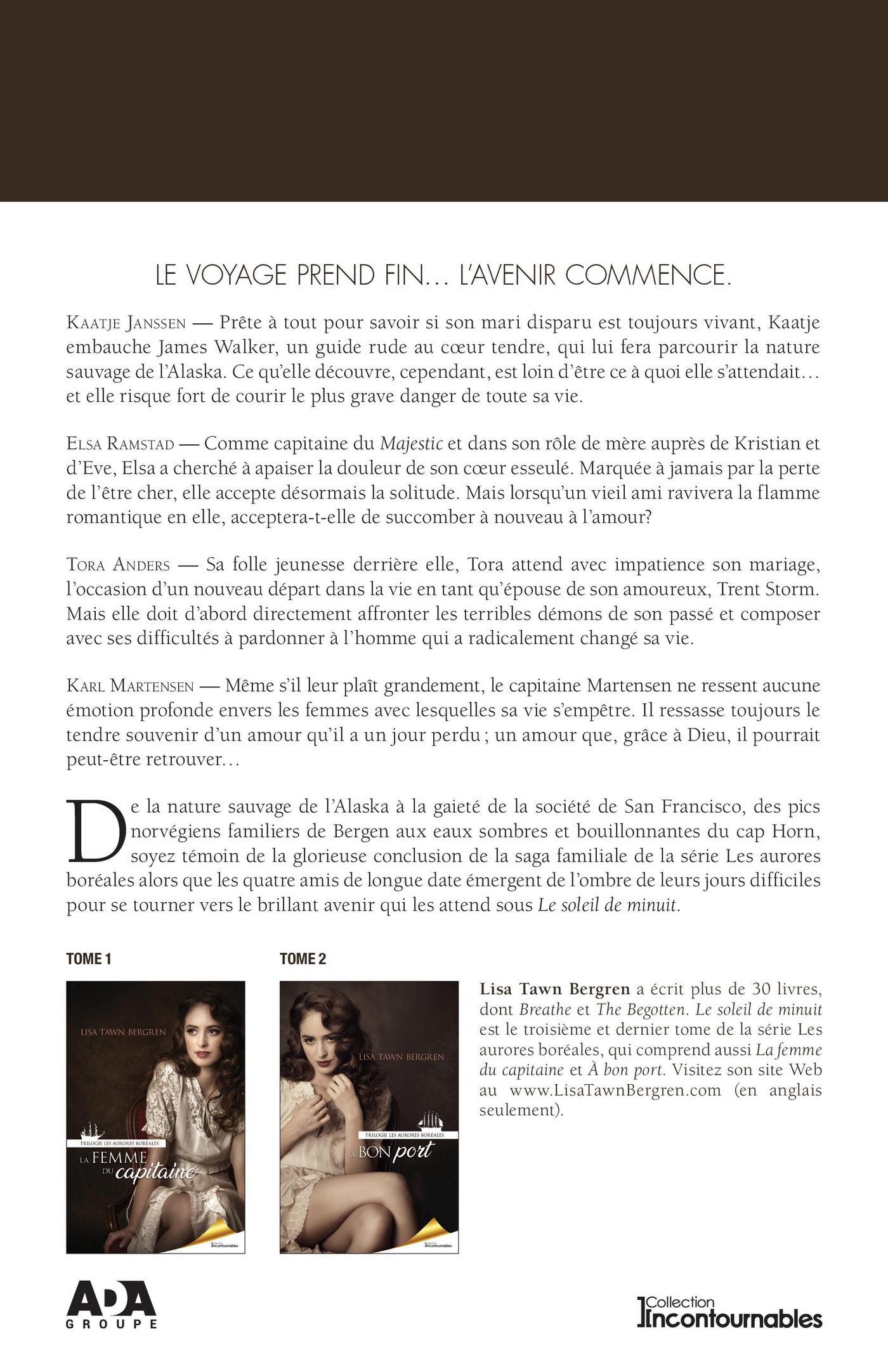 LE VOYAGE PREND FIN… L’AVENIR COMMENCE.Kaatje Janssen — Prête à tout pour savoir si son mari disparu est toujours vivant, Kaatje embauche James Walker, un guide rude au coeur tendre, qui lui fera parcourir la nature sauvage de l’Alaska. Ce qu’elle découvre, cependant, est loin d’être ce à quoi elle s’attendait…, et elle risque fort de courir le plus grave danger de toute sa vie.Elsa Ramstad — Comme capitaine du Majestic et dans son rôle de mère auprès de Kristian et d’Eve, Elsa a cherché à apaiser la douleur de son coeur esseulé. Marquée à jamais par la perte de l’être cher, elle accepte désormais la solitude. Mais lorsqu’un vieil ami ravivera la flamme romantique en elle, acceptera-t-elle de succomber à nouveau à l’amour?Tora Anders — Sa folle jeunesse derrière elle, Tora attend avec impatience son mariage, l’occasion d’un nouveau départ dans la vie en tant qu’épouse de son amoureux, Trent Storm. Mais elle doit d’abord directement affronter les terribles démons de son passé et composer avec ses difficultés à pardonner à l’homme qui a radicalement changé sa vie.Karl Martensen — Même s’il leur plaît grandement, le capitaine Martensen ne ressent aucune émotion profonde envers les femmes avec lesquelles sa vie s’empêtre. Il ressasse toujours le tendre souvenir d’un amour qu’il a un jour perdu — un amour que, grâce à Dieu, il pourrait peut-être retrouver…De la nature sauvage de l’Alaska à la gaîté de la société de San Francisco; des pics norvégiens familiers de Bergen aux eaux sombres et bouillonnantes du cap Horn, soyez témoin de la glorieuse conclusion de la saga familiale de la série Les aurores boréales alors que les quatre amis de longue date émergent de l’ombre de leurs jours difficiles pour se tourner vers le brillant avenir qui les attend sous Le soleil de minuit.