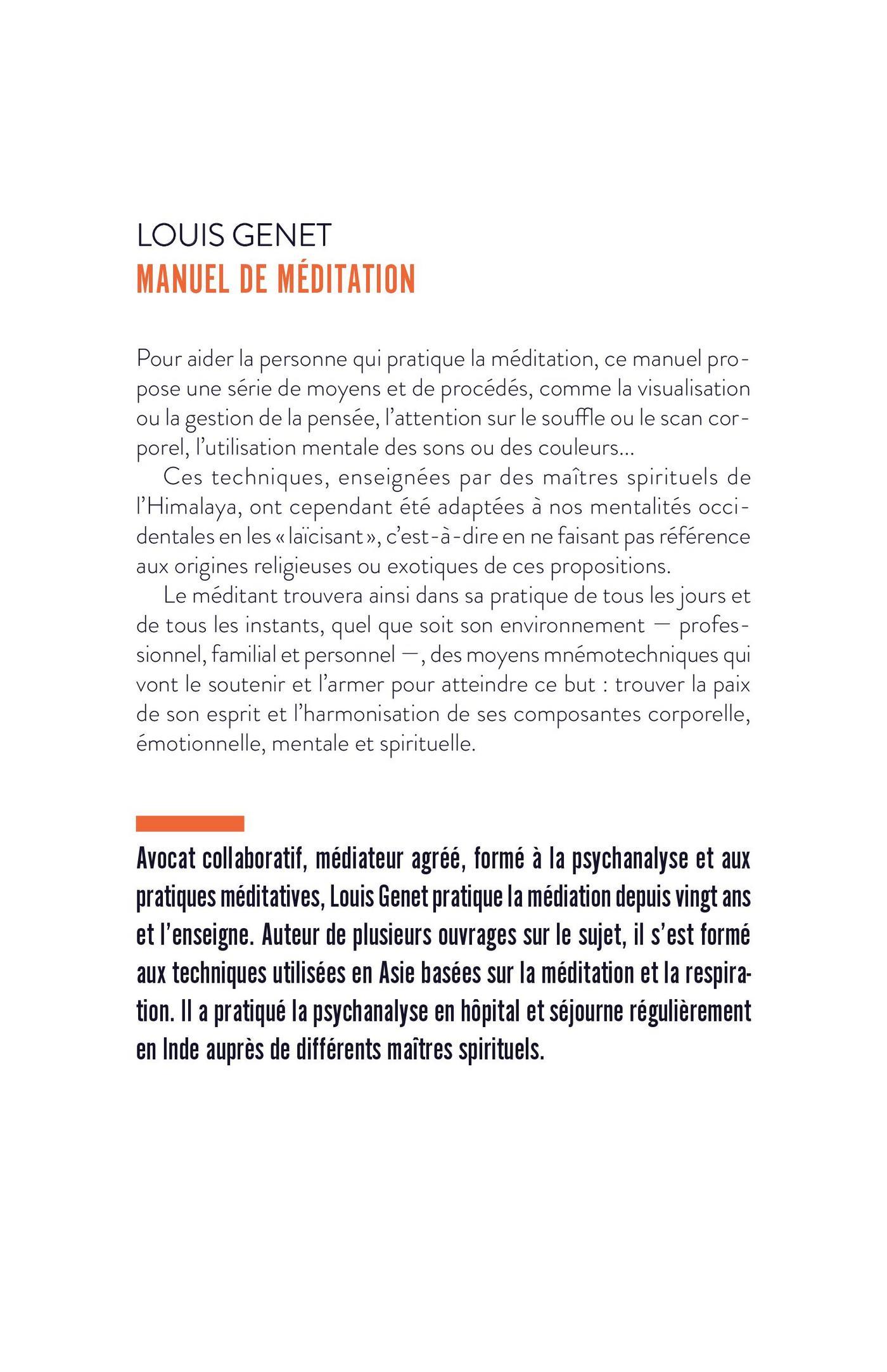 Pour aider la personne qui pratique la méditation, ce manuel propose une série de moyens et de procédés, comme la visualisation ou la gestion de la pensée, l’attention sur le souffle ou le scan corporel, et l’utilisation mentale des sons ou des couleurs.Ces techniques, enseignées par des maîtres spirituels de l’Himalaya, ont cependant été laïcisées pour les adapter à nos mentalités occidentales, c’est-à-dire qu’elles ne font aucune référence à quelque origine religieuse ou exotique que ce soit.Ainsi, quel que soit son environnement (professionnel, familial et personnel), le méditant trouvera, dans sa pratique de tous les jours et de tous les instants, des moyens mnémotechniques qui le soutiendront et l’outilleront pour atteindre ce but: trouver la paix de son esprit, et harmoniser ses composantes corporelle, émotionnelle, mentale et spirituelle.