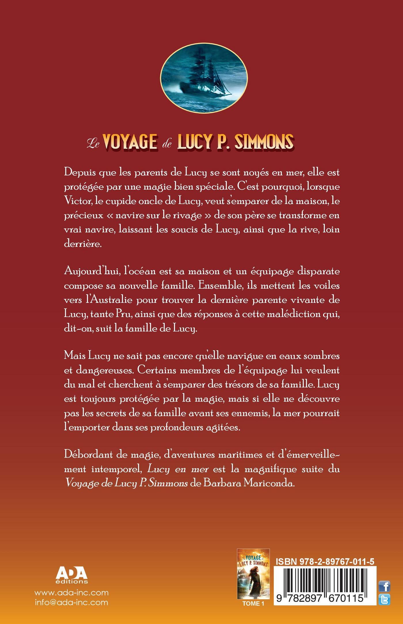 Depuis que les parents de Lucy se sont noyés en mer, elle est protégée par une magie bien spéciale. C’est pourquoi, lorsque Victor, le cupide oncle de Lucy, voulut s’emparer de la maison, le précieux « navire sur la rive » de son père se transforma en vrai navire, laissant les soucis de Lucy, ainsi que la rive, loin derrière.Aujourd’hui, l’océan est sa maison et un équipage disparate compose sa nouvelle famille. Ensemble, ils mettent les voiles vers l’Australie pour trouver la dernière parente vivante de Lucy, Tante Pru, ainsi que des réponses à cette malédiction qui, dit-on, suit la famille de Lucy.Mais Lucy ne sait pas encore qu’elle navigue en eaux sombres et dangereuses. Certains membres de l’équipage lui veulent du mal et cherchent à s’emparer des trésors de sa famille. Lucy est toujours protégée par la magie, mais si elle ne découvre pas les secrets de sa famille avant ses ennemis, la mer pourrait l’emporter dans ses profondeurs agitées.Débordant de magie, d’aventures maritimes et d’émerveille ment intemporel, Lucy en mer est la magnifque suite du Voyage de Lucy P. Simmons de Barbara Mariconda.