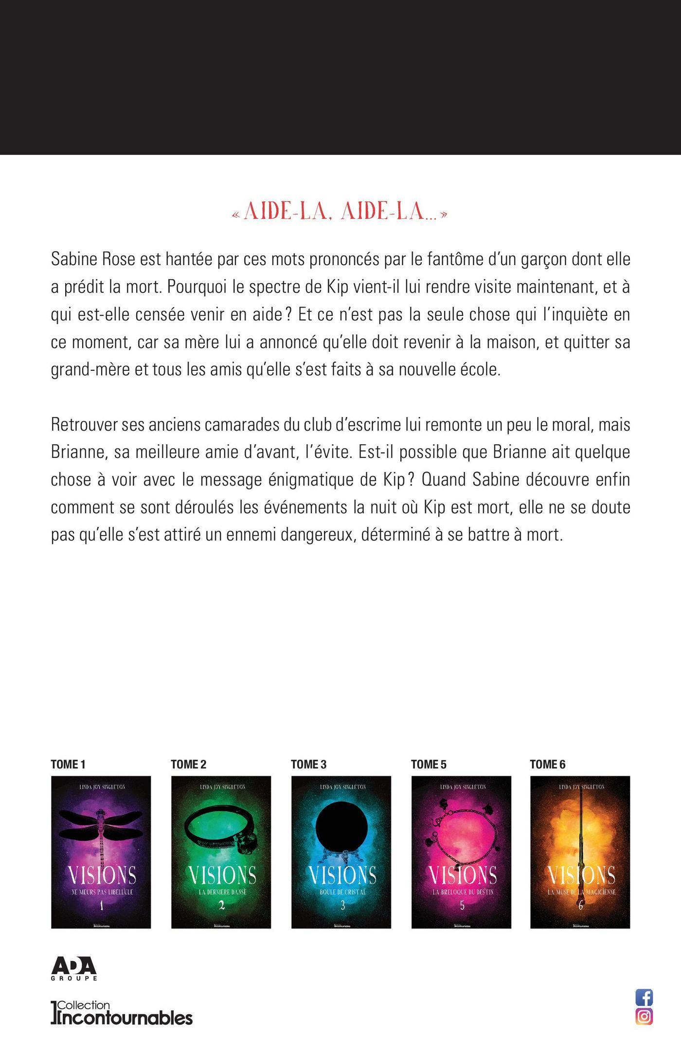 «Aide-la, aide-la…»Sabine Rose est hantée par ces mots prononcés par le fantôme d’un garçon dont elle a prédit la mort. Pourquoi le spectre de Kip vient-il lui rendre visite maintenant, et à qui est-elle censée venir en aide? Et ce n’est pas la seule chose qui l’inquiète en ce moment, car sa mère lui a annoncé qu’elle doit revenir à la maison, et quitter sa grand-mère et tous les amis qu’elle s’est faits à sa nouvelle école.Retrouver ses anciens camarades du club d’escrime lui remonte un peu le moral, mais Brianne, sa meilleure amie d’avant, l’évite. Est-il possible que Brianne ait quelque chose à voir avec le message énigmatique de Kip? Quand Sabine découvre enfin le déroulement des événements la nuit où Kip est mort, elle ne se doute pas qu’elle s’est attiré un ennemi dangereux déterminé à se battre à mort.