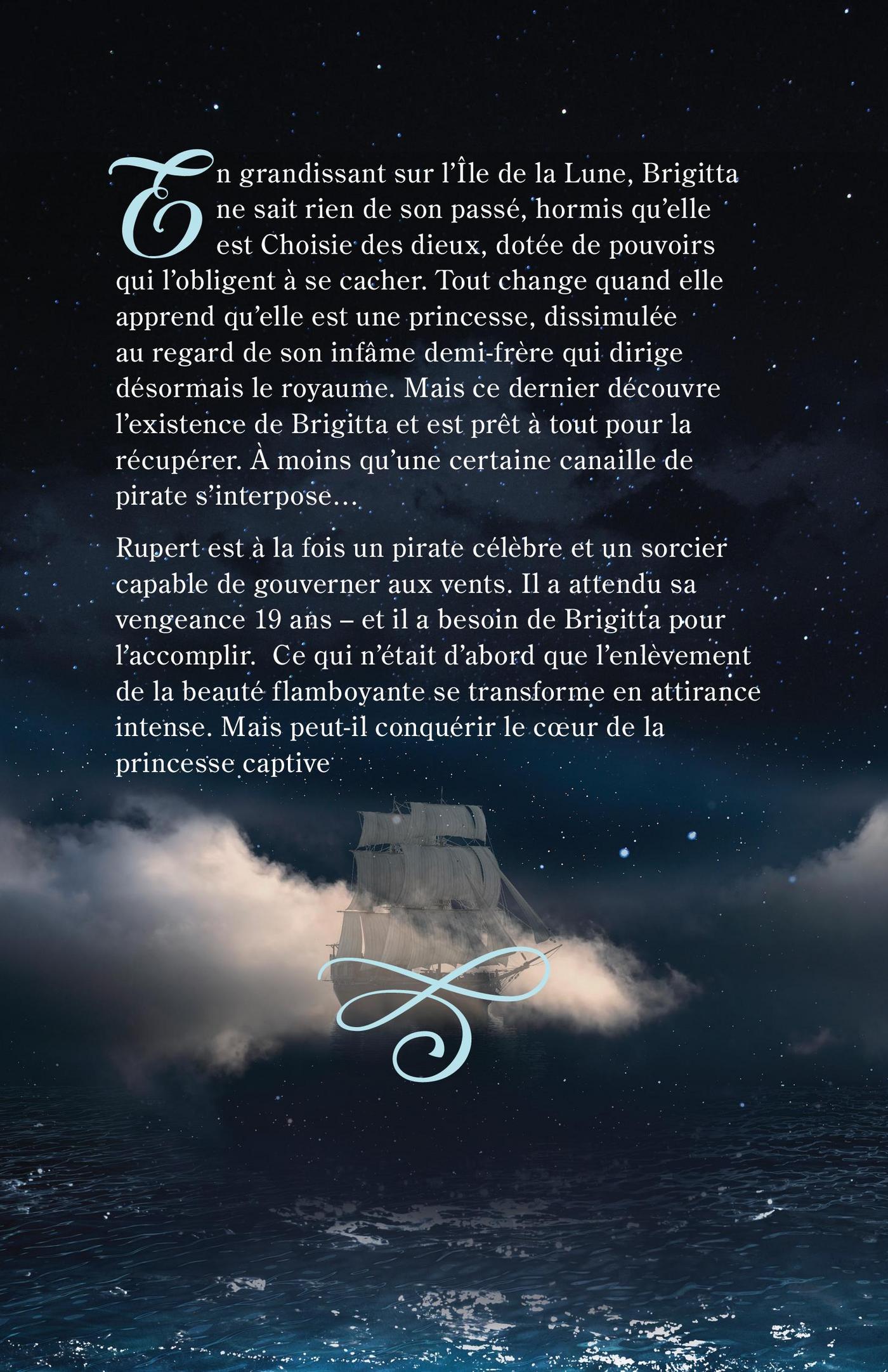 En grandissant sur l’Île de la Lune, Brigitta ne sait rien de son passé, hormis qu’elle est Choisie des dieux, dotée de pouvoirs qui l’obligent à se cacher. Tout change quand elle apprend qu’elle est une princesse, dissimulée au regard de son infâme demifrère qui dirige désormais le royaume. Mais ce dernier découvre l’existence de Brigitta et est prêt à tout pour la récupérer. À moins qu’une certaine canaille de pirate s’interpose…Rupert est à la fois un pirate célèbre et un sorcier capable de gouverner aux vents. Il a attendu sa vengeance 19 ans – et il a besoin de Brigitta pour l’accomplir. Ce qui n’était d’abord que l’enlèvement de la beauté flamboyante se transforme en attirance intense. Mais peut-il conquérir le coeur de la princesse captive?