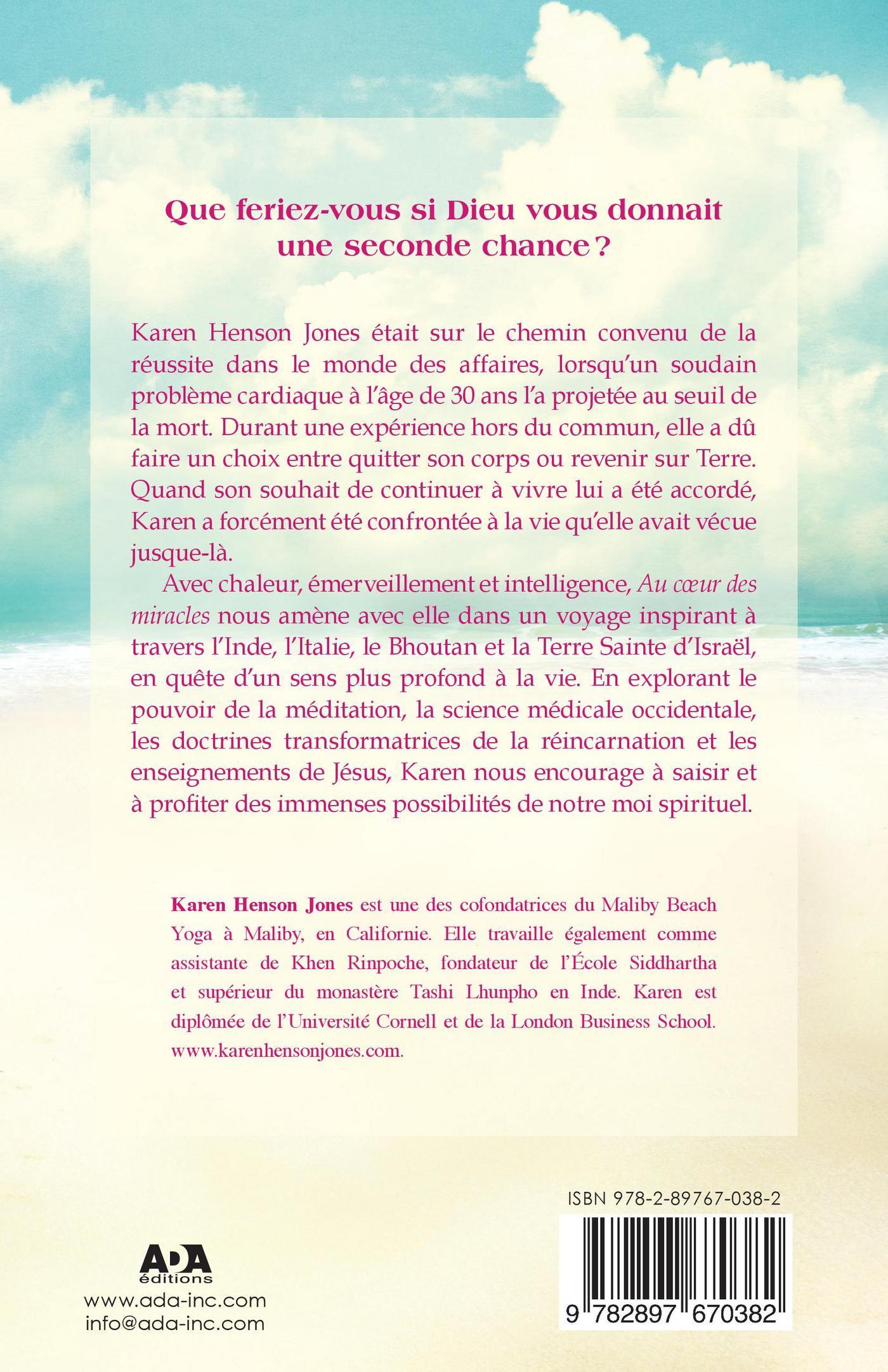 Karen Henson Jones était sur le chemin convenu de la réussite dans le monde des affaires, lorsqu’un soudain problème cardiaque à l’âge de 30 ans l’a projetée au seuil de la mort. Durant une expérience hors du commun, elle a dû faire un choix entre quitter son corps ou revenir sur Terre. Quand son souhait de continuer à vivre lui a été accordé, Karen a forcément été confrontée à la vie qu’elle avait vécue jusque-là.Avec chaleur, émerveillement et intelligence, Au cœur des miracles nous amène avec elle dans un voyage inspirant à travers l’Inde, l’Italie, le Bhoutan et la Terre Sainte d’Israël, en quête d’un sens plus profond à la vie. En explorant le pouvoir de la méditation, la science médicale occidentale, les doctrines transformatrices de la réincarnation et les enseignements de Jésus, Karen nous encourage à saisir et à profter des immenses possibilités de notre moi spirituel.