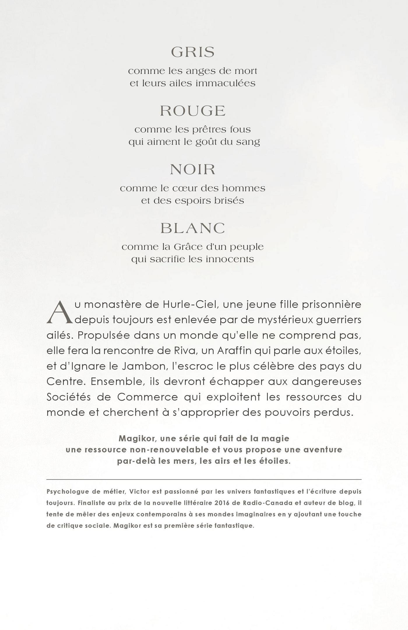 Gris comme les anges de mort et leurs ailes immaculées Rouge comme les prêtres fous qui aiment le goût du sang Noir comme le coeur des hommes et des espoirs brisés Blanc comme la Grâce d’un peuple qui sacrifie les innocents Au monastère de Hurle-Ciel, une jeune fille prisonnière depuis toujours est enlevée par de mystérieux guerriers ailés. Propulsée dans un monde qu’elle ne comprend pas, elle fera la rencontre de Riva, un Araffin qui parle aux étoiles, et d’Ignare le Jambon, l’escroc le plus célèbre des pays du Centre. Ensemble, ils devront échapper aux dangereuses Sociétés de Commerce qui exploitent les ressources du mondeet cherchent à s’approprier des pouvoirs perdus.Magikor, une série qui fait de la magie une ressource non-renouvelable et vous propose une aventure par-delà les mers, les airs et les étoiles.