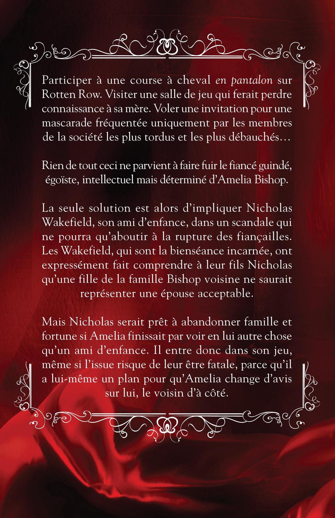 Participer à une course à cheval en pantalon sur Rotten Row. Visiter une salle de jeu qui ferait perdre connaissance à sa mère. Voler une invitation pour une mascarade fréquentée uniquement par les membres de la société les plus tordus et les plus débauchés…Rien de tout ceci ne parvient à faire fuir le fiancé guindé, égoïste, intellectuel et déterminé d’Amelia Bishop.La seule solution est alors d’impliquer Nicholas Wakefield, son ami d’enfance, dans un scandale qui ne pourra qu’aboutir à la rupture des fiançailles. Les Wakefield, qui sont la bienséance incarnée, ont expressément fait comprendre à leur fils Nicholas qu’une fille de la famille Bishop voisine ne saurait représenter une épouse acceptable.Mais Nicholas serait prêt à abandonner famille et fortune si Amelia finissait par voir en lui autre chose qu’un ami d’enfance. Il entre donc dans son jeu, même si l’issue risque de leur être fatale, parce qu’il a lui-même un plan pour qu’Amelia change d’avis sur lui, le voisin d’à côté.