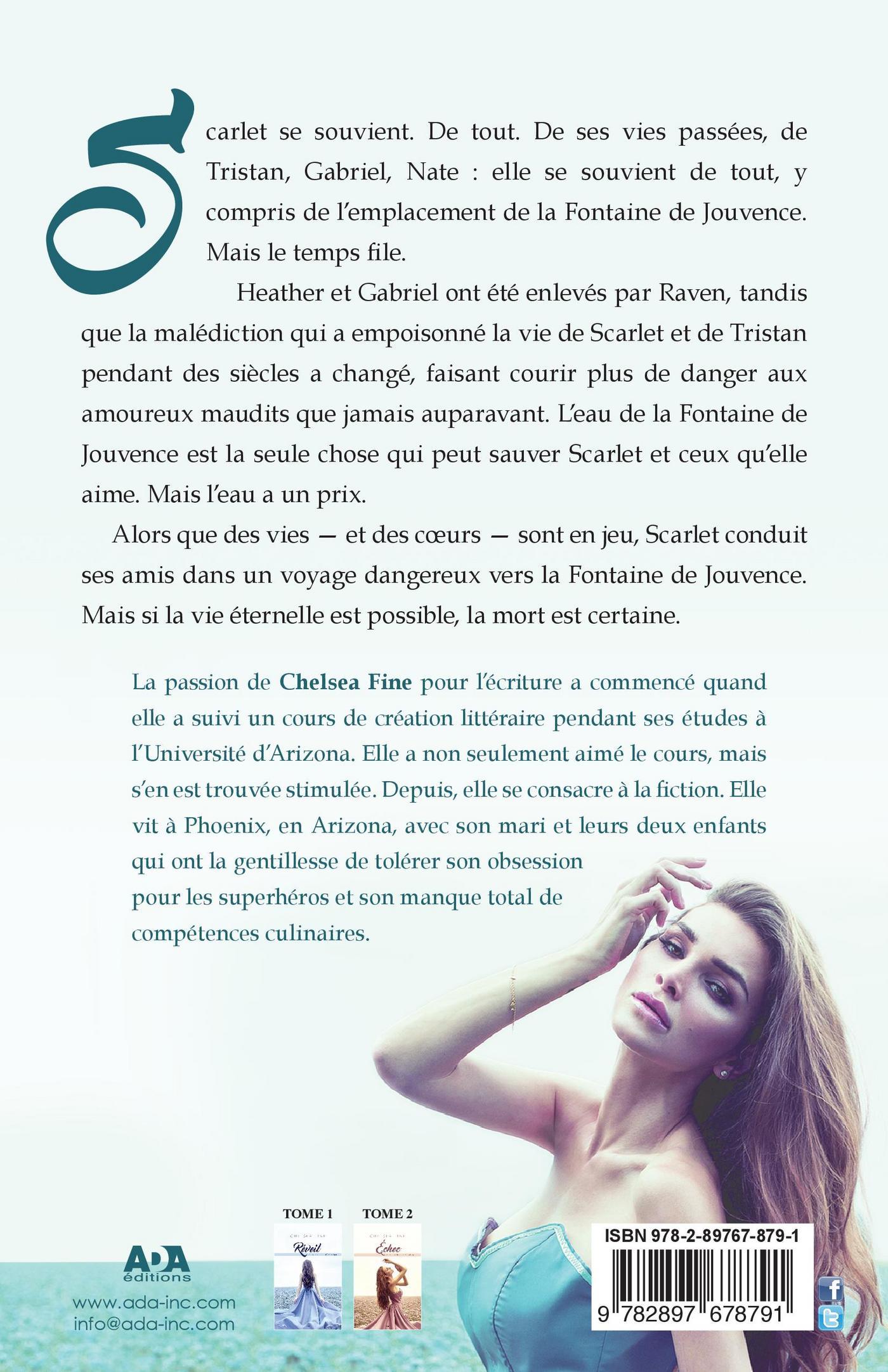 De ses vies passées, de Tristan, de Gabriel, de Nate : elle se souvient de tout, — y compris de l’emplacement de la Fontaine de Jouvence. Mais le temps file. Heather et Gabriel ont été enlevés par Raven, tandis que la malédiction qui a empoisonné la vie de Scarlet et de Tristan pendant des siècles a changé, faisant courir plus de danger aux amoureux maudits que jamais auparavant. L’eau de la Fontaine de Jouvence est la seule chose qui peut sauver Scarlet et ceux qu’elle aime. Mais l’eau a un prix. Alors que des vies — et des coeurs — sont en jeu, Scarlet conduit ses amis dans un voyage dangereux vers la Fontaine de Jouvence. Mais si la vie éternelle est possible, la mort est certaine.