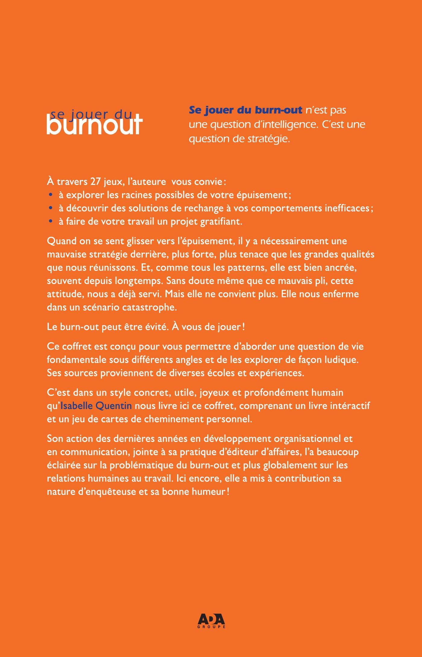 Quand on se sent glisser vers l’épuisement, il y a nécessairement une mauvaise stratégie derrière, plus forte, plus tenace que les grandes qualités que nous réunissons. Et, comme tous les patterns, elle est bien ancrée, souvent depuis longtemps. Sans doute même que ce mauvais pli, cette attitude, nous a déjà servi. Mais elle ne convient plus. Elle nous enferme dans un scénario catastrophe.Le burn-out peut être évité. À vous de jouer!