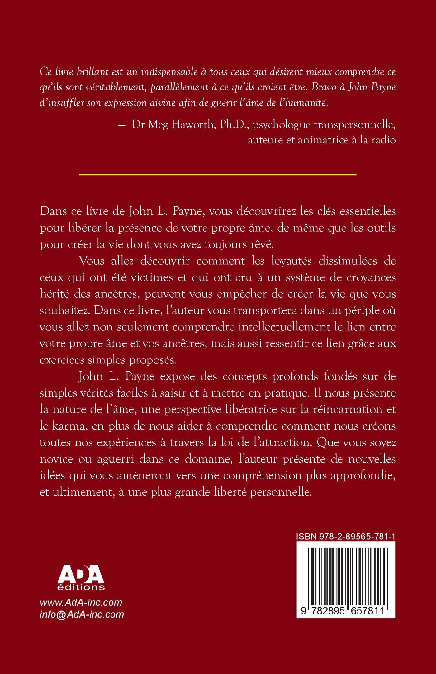 Dans ce livre de John L. Payne, vous découvrirez les clés essentielles pour libérer la présence de votre propre âme, de même que les outils pour créer la vie dont vous avez toujours rêvé. Vous allez découvrir comment les loyautés dissimulées de ceux qui ont été victimes et qui ont cru à un système de croyances hérité des ancêtres, peuvent vous empêcher de créer la vie que vous souhaitez. Dans ce livre, l’auteur vous transportera dans un périple où vous allez non seulement comprendre intellectuellement le lien entre votre propre âme et vos ancêtres, mais aussi ressentir ce lien grâce aux exercices simples proposés. John L. Payne expose des concepts profonds fondés sur de simples vérités faciles à saisir et à mettre en pratique. Il nous présente la nature de l’âme, une perspective libératrice sur la réincarnation et le karma, en plus de nous aider à comprendre comment nous créons toutes nos expériences à travers la loi de l’attraction. Que vous soyez novice ou aguerri dans ce domaine, l’auteur présente de nouvelles idées qui vous amèneront vers une compréhension plus approfondie, et ultimement, à une plus grande liberté personnelle.