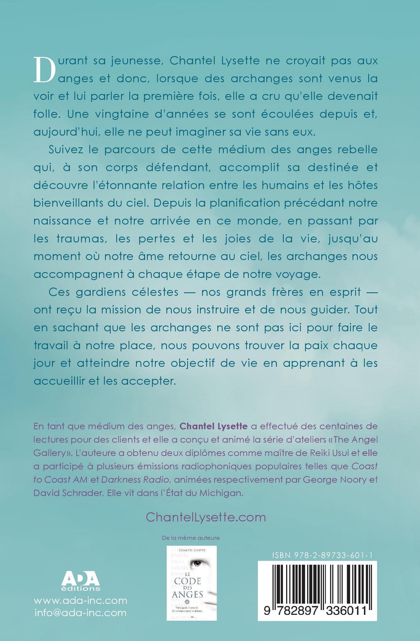 Durant sa jeunesse, Chantel Lysette ne croyait pas aux anges et, donc, lorsque des archanges sont venus la voir et lui parlerla première fois, elle a cru qu’elle devenait folle. Une vingtaine d’années se sont écoulées depuis et, aujourd’hui, elle ne peutimaginer sa vie sans eux.Suivez le parcours de cette médium des anges rebelle qui, à son corps défendant, accomplit sa destinée et découvre l’étonnante relation entre les humains et les hôtes bienveillants du ciel. Depuis la planification précédant notre naissance et notre arrivée en ce monde, en passant par les traumas, les pertes et les joies de la vie, jusqu’au moment où notre âme retourne au ciel, les archanges nous accompagnent à chaque étape de notre voyage.Ces gardiens célestes — nos grands frères en esprit — ont reçu la mission de nous instruire et de nous guider. Tout en sachantque les archanges ne sont pas ici pour faire le travail à notre place, nous pouvons trouver la paix chaque jour et atteindrenotre objectif de vie en apprenant à les accueillir et les accepter.