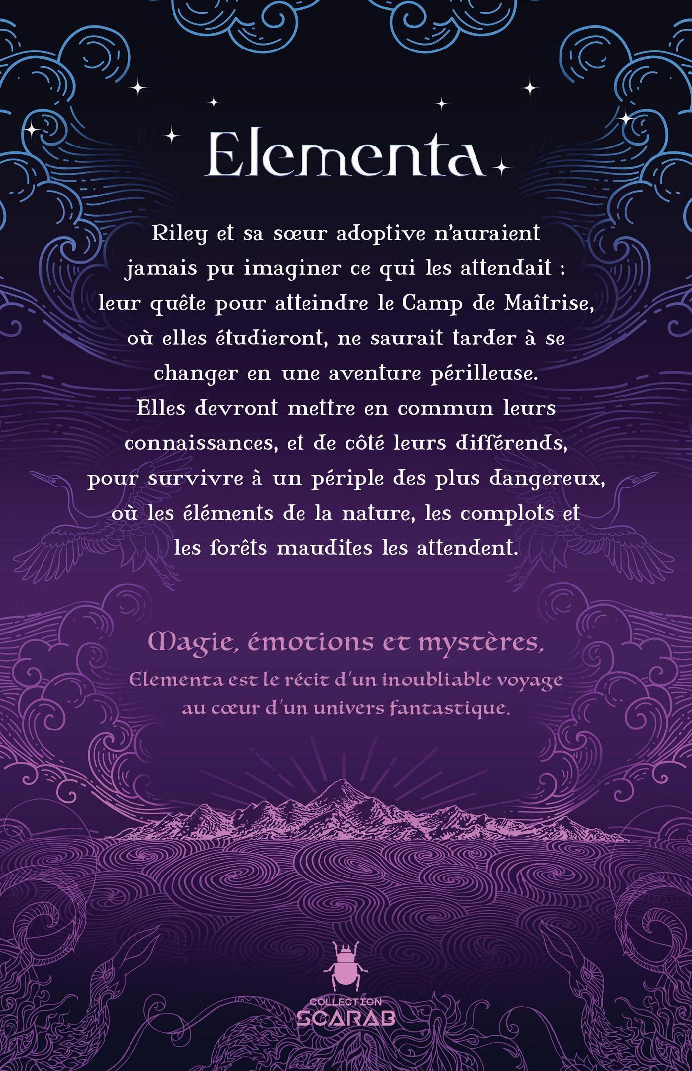 La jeune Riley et sa soeur adoptive n’auraient jamais pu imaginer ce qui les attendait. La quête d’atteindre le Camp de Maîtrise afin d’étudier leur don respectif semblait bien simple au départ. Toutefois, le voyage ne tardera pas à se transformer en quelque chose de plutôt obscur. Elles auront à mettre en commun leurs connaissances, et de côté leurs différends, afin de survivre à ce périple plus que dangereux. Elles passeront par toute une gamme d’émotions: la joie, l’amitié, l’attente, l’amour, la trahison, le deuil. Au fil des rencontres, elles vivront une aventure incroyable, aux nombreux rebondissements, et devront prendre de déchirantes décisions.L’histoire se déroule dans l’univers d’Elementa, un monde mystérieux où forces de la nature, forêts maudites et animaux compagnons se côtoient en harmonie… ou presque.