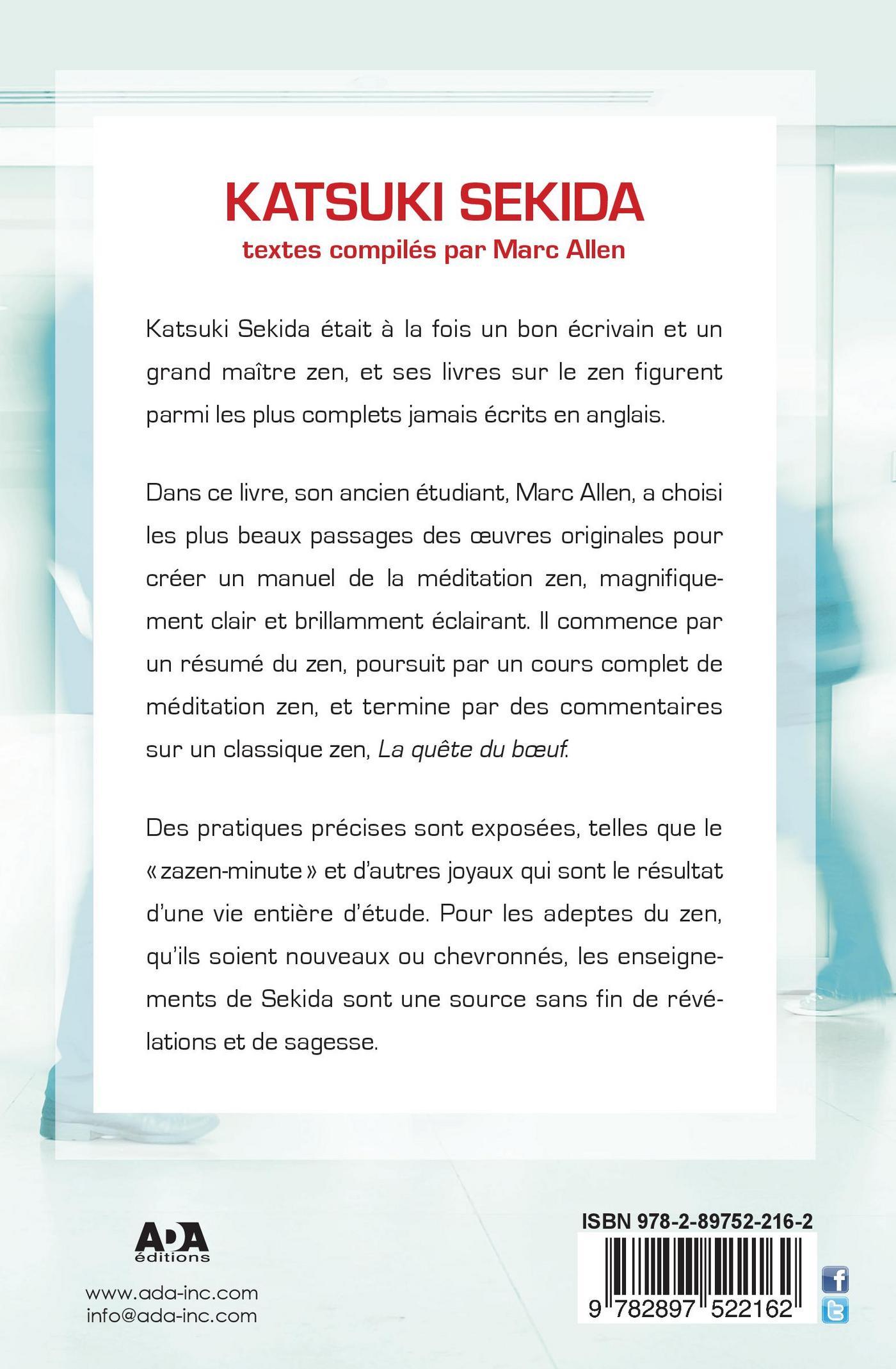 Katsuki Sekida était à la fois un bon écrivain et un grand maître zen, et ses livres sur le zen figurent parmi les plus complets jamais écrits en anglais. Dans ce livre, son ancien étudiant, Marc Allen, a choisi les plus beaux passages des oeuvres originales pour créer un manuel de la méditation zen, magnifiquement clair et brillamment éclairant. Il commence par un résumé du zen, poursuit par un cours complet de méditation zen, et termine par des commentaires sur un classique zen, La quête du boeuf. Des pratiques précises sont exposées, telles que le «zazen-minute» et d’autres joyaux qui sont le résultat d’une vie entière d’étude. Pour les adeptes du zen,qu’ils soient nouveaux ou chevronnés, les enseignements de Sekida sont une source sans fin de révélations et de sagesse.
