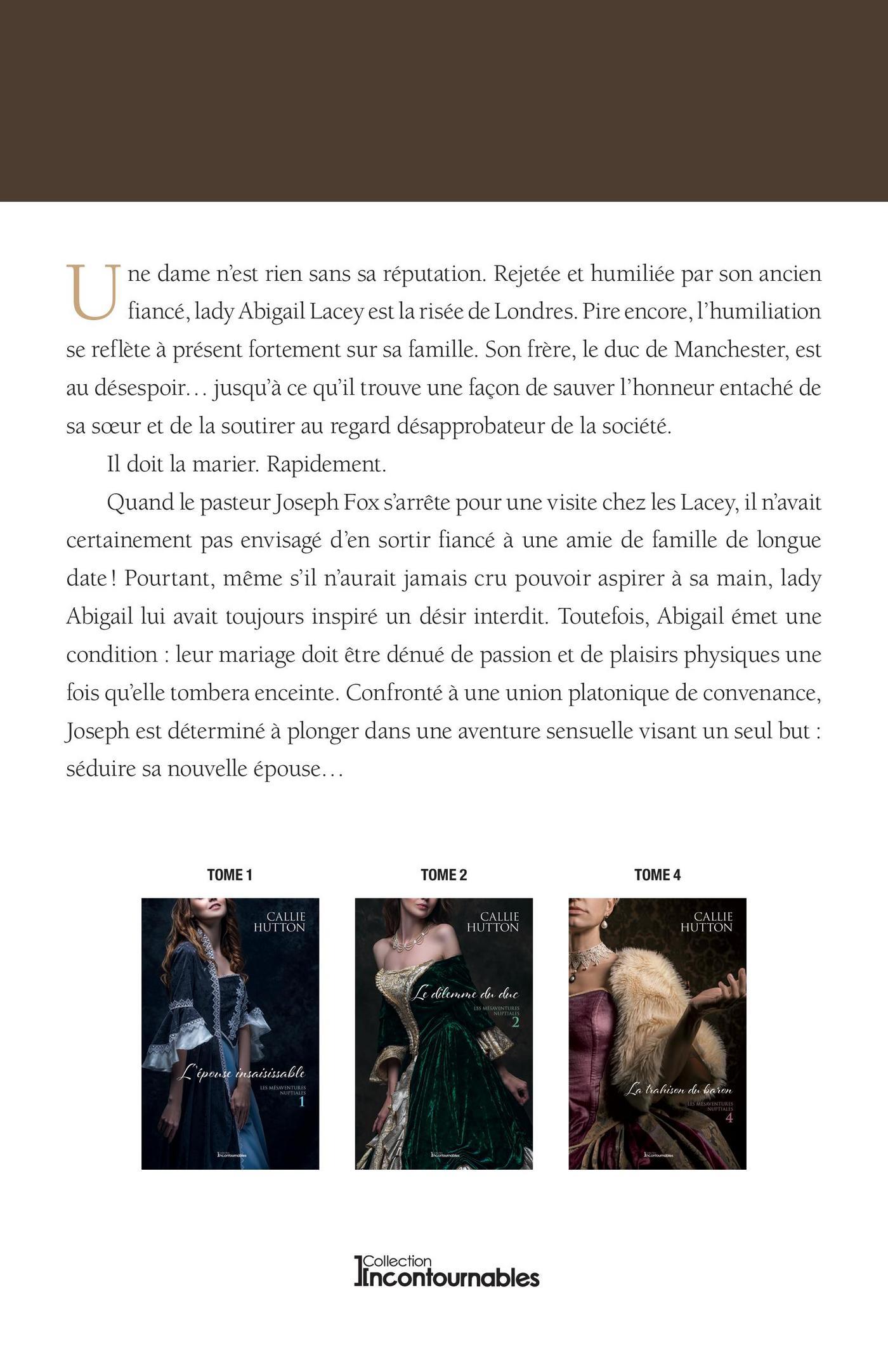 Londres, 1815. Une dame n’est rien sans sa réputation. Rejetée et humiliée par son ancien fiancé, lady Abigail Lacey est la risée de Londres. Pire encore, l’humiliation se reflète à présent fortement sur sa famille. Son frère, le duc de Manchester, est au désespoir... jusqu’à ce qu’il trouve une façon de sauver l’honneur entaché de sa soeur et la soutirer au regard désapprobateur de la société. Il doit la marier rapidement. Quand le pasteur Joseph Fox va visiter les Lacey, il n’avait certainement pas envisagé de partir fiancé à une amie de famille ! Pourtant, même s’il n’aurait jamais cru pouvoir aspirer à sa main, lady Abigail lui avait toujours inspiré un désir interdit. Toutefois, Abigail émet une condition: leur mariage doit être dénué de passion et de plaisirs physiques une fois qu’elle tombera enceinte. Confronté à une union platonique de convenance, Joseph est déterminé à plonger dans une aventure sensuelle visant un seul but: séduire sa nouvelle épouse...