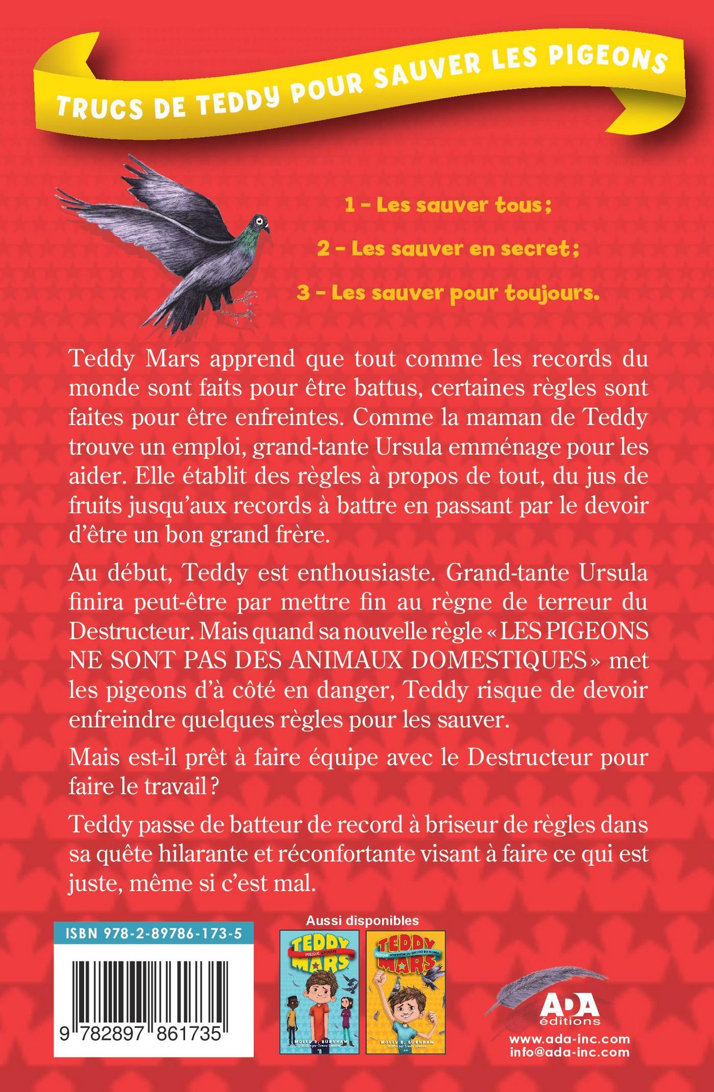 1 – Les sauver tous;2 – Les sauver en secret;3 – Les sauver pour toujours.Teddy Mars apprend que tout comme les records du monde sont faits pour être battus, certaines règles sont faites pour être enfreintes. Comme la maman de Teddytrouve un emploi, grand-tante Ursula emménage pour les aider. Elle établit des règles à propos de tout, du jus de fruits jusqu’aux records à battre en passant par le devoir d’être un bon grand frère.Au début, Teddy est enthousiaste. Grand-tante Ursula finira peut-être par mettre fin au règne de terreur du Destructeur. Mais quand sa nouvelle règle «LES PIGEONS NE SONT PAS DES ANIMAUX DOMESTIQUES» met les pigeons d’à côté en danger, Teddy risque de devoir enfreindre quelques règles pour les sauver.Mais est-il prêt à faire équipe avec le Destructeur pour faire le travail?Teddy passe de batteur de record à briseur des règles dans sa quête hilarante et réconfortante visant à faire ce qui est juste, même si c’est mal.