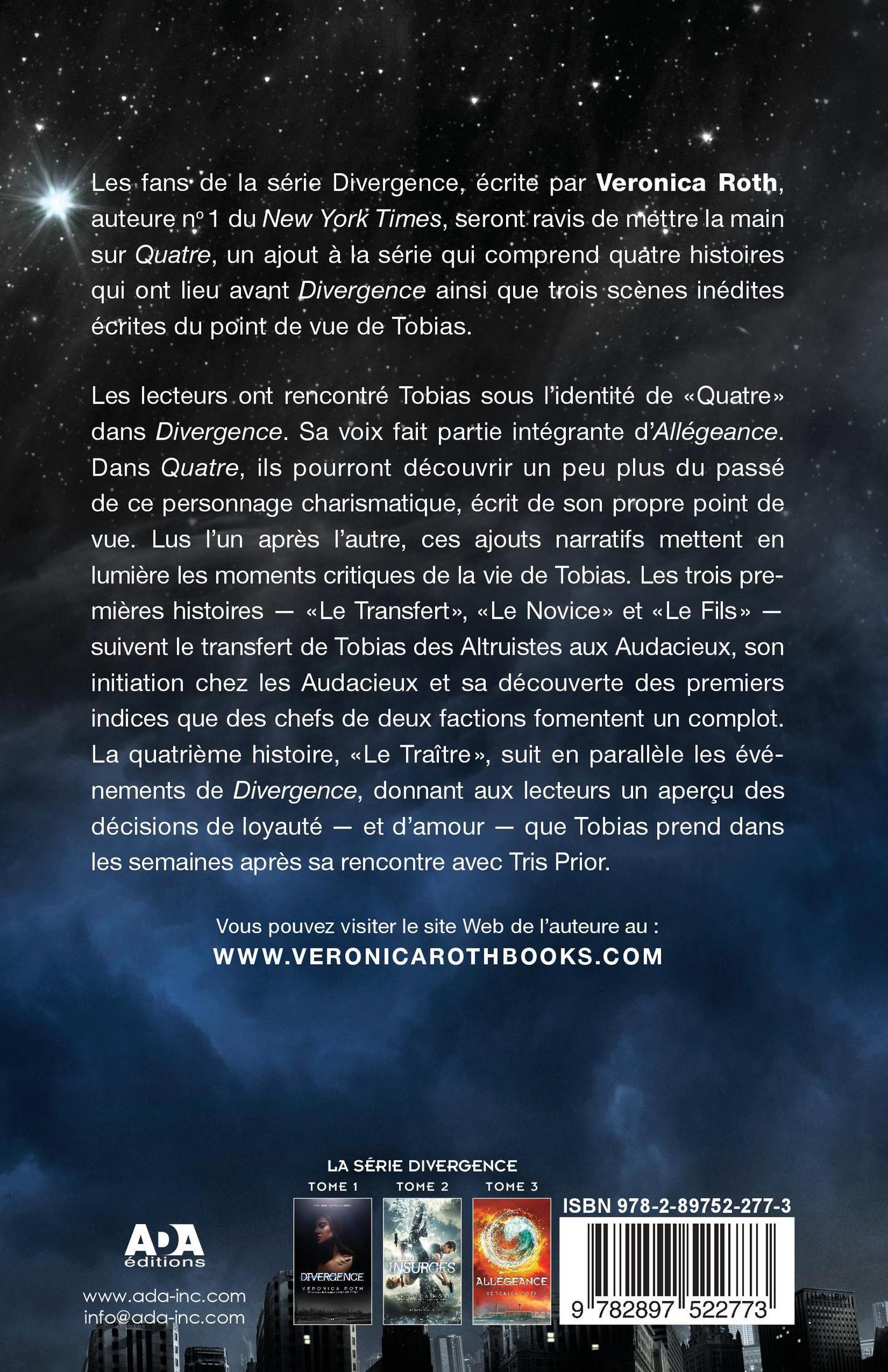 Les fans de la série Divergence, écrite par Veronica Roth, auteure no.1 du New York Times, seront ravis de mettre la main sur Quatre — un recueil divergent, un ajout à la série qui comprend quatre histoires qui ont lieu avant Divergence ainsi que trois scènes inédites écrites du point de vue de Tobias. Les lecteurs ont rencontré Tobias sous l’identité de «Quatre» dans Divergence. Sa voix fait partie intégrante d’Allégeance. Dans Quatre — un recueil divergent, ils pourront découvrir un peu plus du passé de ce personnage charismatique, écrit de son propre point de vue. Lus l’un après l’autre, ces ajouts narratifs mettent en lumière les moments critiques de la vie de Tobias. Les trois premières histoires — «Le transfert», «L’initiation» et «Le fils» — suivent le transfert de Tobias des Altruistes aux Audacieux, son initiation chez les Audacieux et sa découverte des premiers indices que des leaders de deux factions fomentent un complot. La quatrième histoire, «Le traître», suit en parallèle les événements de Divergence, donnant aux lecteurs un aperçu des décisions de loyauté – et d’amour – que Tobias prend dans les semaines après sa rencontre avec Tris Prior.
