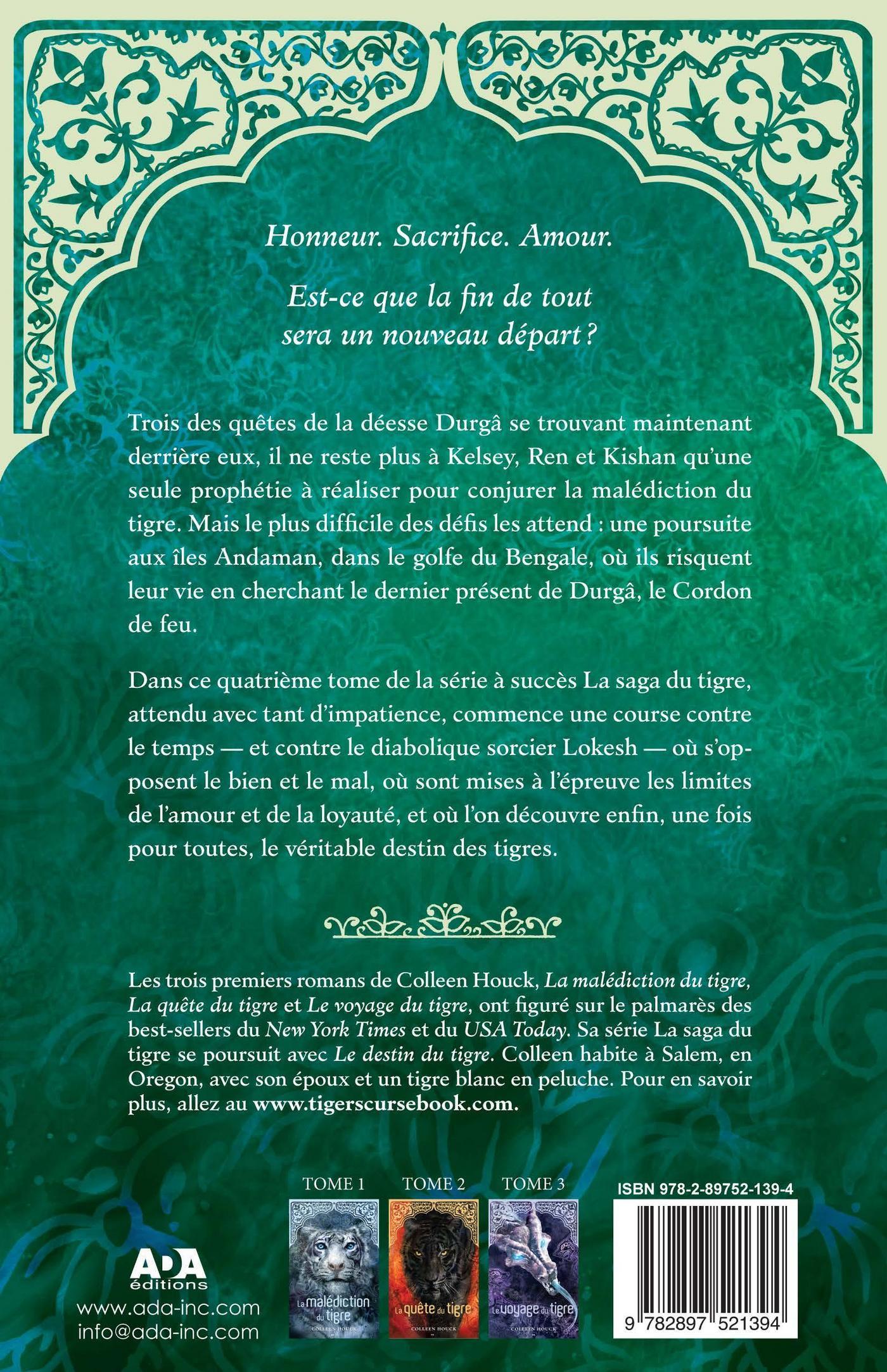 Trois des quêtes de la déesse Durgâ se trouvant maintenant derrière eux, il ne reste plus à Kelsey, Ken et Kishan qu’une seule prophétie à réaliser pour conjurer la malédiction du tigre. Mais le plus difficile des défis les attend : une poursuite aux îles Andaman, dans le golfe du Bengale, où ils risquent leur vie, à la recherche du dernier présent de Durgâ, le Cordon de feu. Dans ce quatrième volume de la série à succès La malédiction du tigre, attendu avec tant d’impatience, commence une course contre le temps — et contre le diabolique sorcier Lokesh —, où s’opposent le bien et le mal, où sont mises à l’épreuve les limites de l’amour et de la loyauté, et où l’on découvre enfin, une fois pour toutes, le véritable destin des tigres.