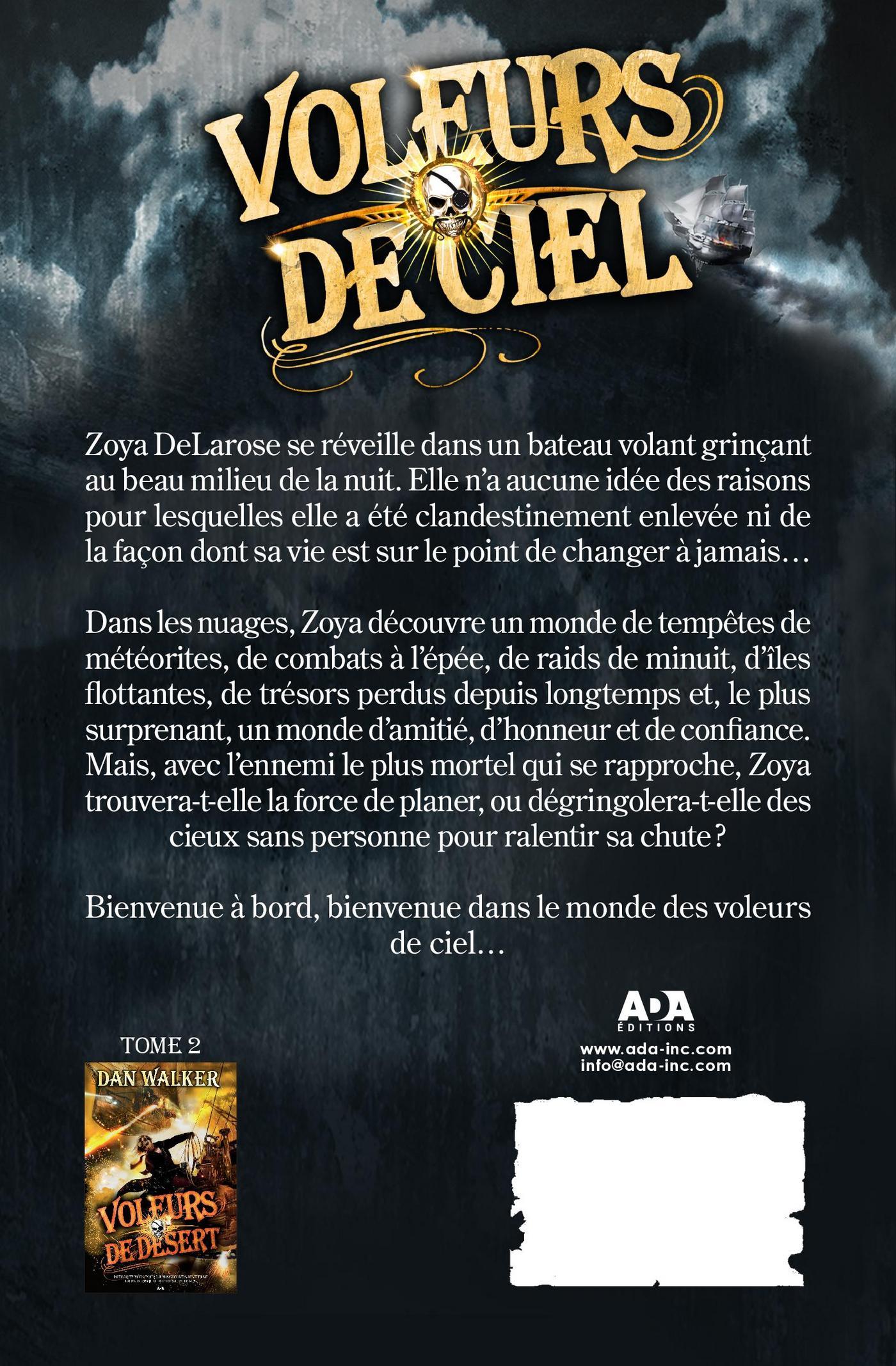 Zoya DeLarose se réveille dans un bateau volant grinçant au beau milieu de la nuit. Elle n’a aucune idée des raisons pour lesquelles elle a été clandestinement enlevée ni de la façon dont sa vie est sur le point de changer à jamais…Dans les nuages, Zoya découvre un monde de tempêtes de météorites, de combats à l’épée, de raids de minuit, d’îles flottantes, de trésors perdus depuis longtemps et, le plus surprenant, un monde d’amitié, d’honneur et de confiance. Mais, avec l’ennemi le plus mortel qui se rapproche, Zoya trouvera-t-elle la force de planer, ou dégringolera-t-elle des cieux sans personne pour ralentir sa chute?Bienvenue à bord, bienvenue dans le monde des voleurs de ciel…