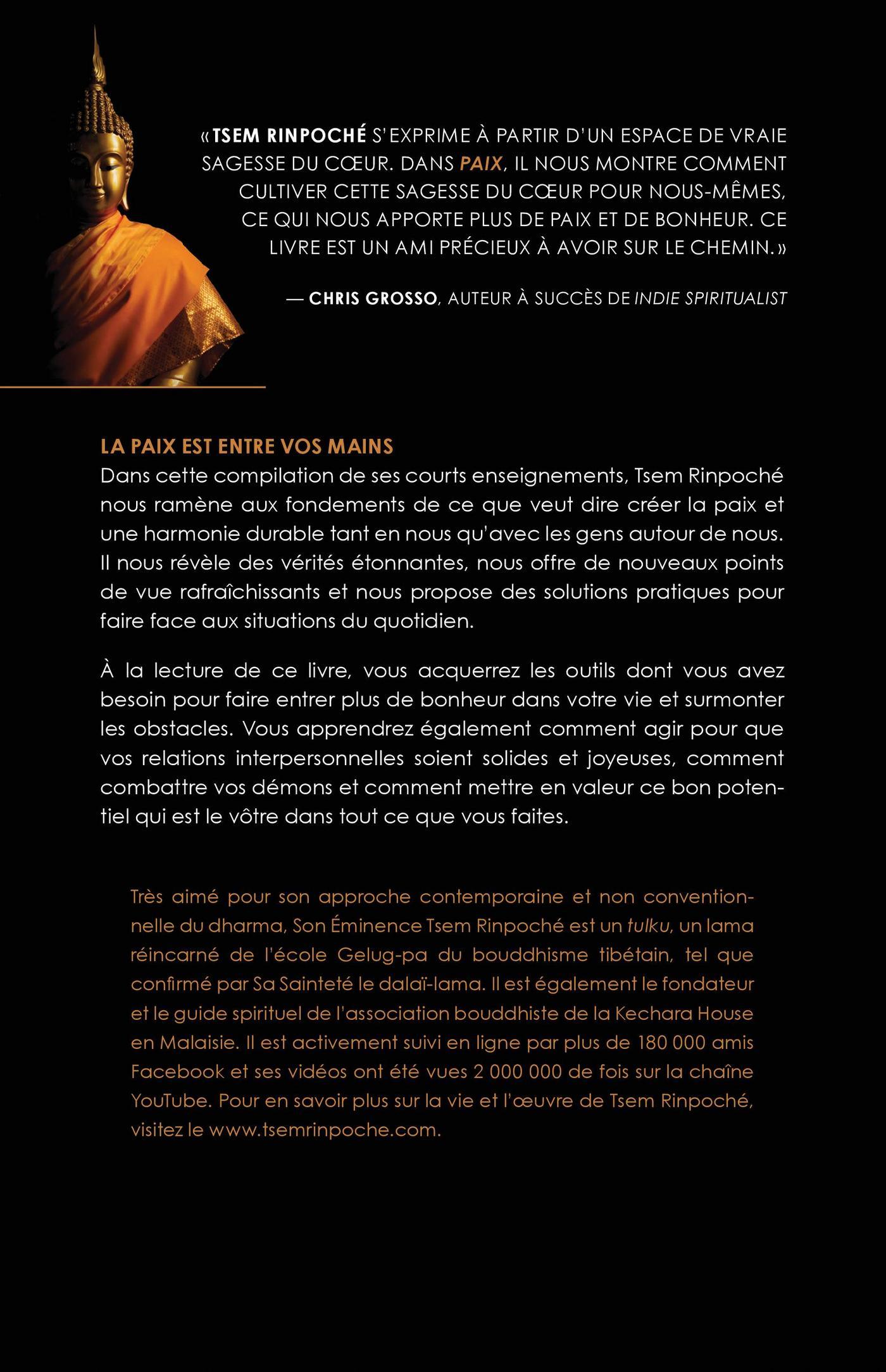 LA PAIX EST ENTRE VOS MAINSDans cette compilation de ses courts enseignements, Tsem Rinpoché nous ramène aux fondements de ce que veut dire créer la paix et une harmonie durable tant en nous qu’avec les gens autour de nous. Il nous révèle des vérités étonnantes, nous offre de nouveaux points de vue rafraîchissants et nous propose des solutions pratiques pour faire face aux situations du quotidien.À la lecture de ce livre, vous acquerrez les outils dont vous avez besoin pour faire entrer plus de bonheur dans votre vie et surmonter les obstacles. Vous apprendrez également comment agir pour que vos relations interpersonnelles soient solides et joyeuses, comment combattre vos démons et comment mettre en valeur ce bon potentiel qui est le vôtre dans tout ce que vous faites.