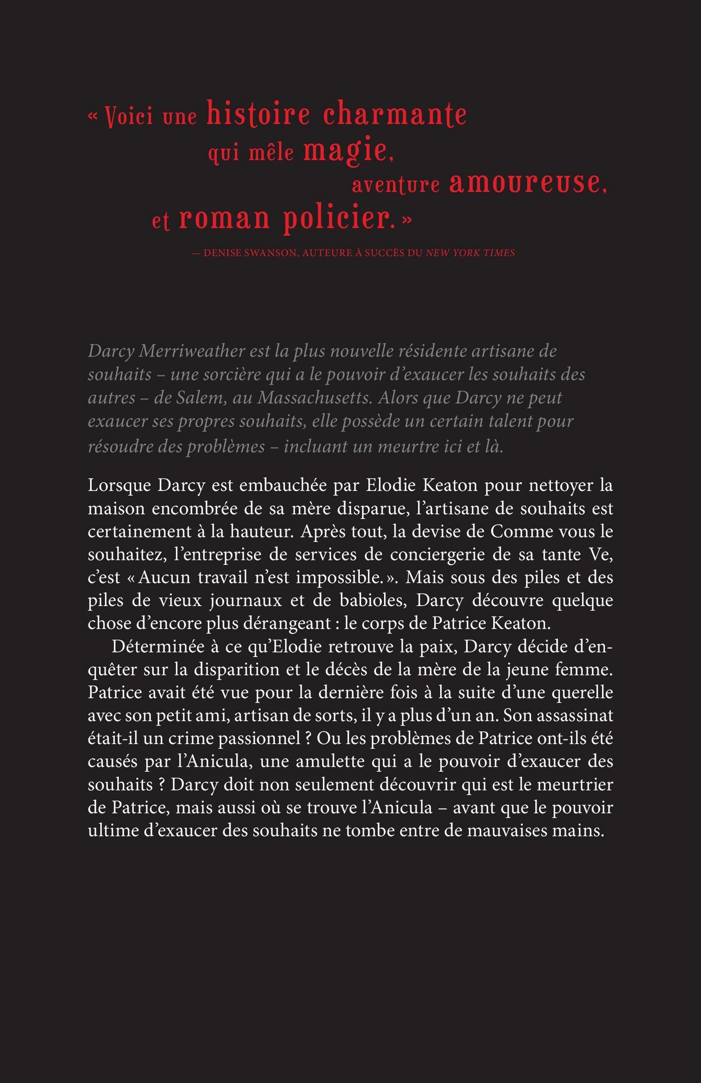 Darcy Merriweather est la nouvelle résidente artisane de souhaits — une sorcière qui ale pouvoir d’exaucer les souhaits des autres — de Salem, au Massachusetts. Alors queDarcy ne peut exaucer ses propres souhaits, elle possède un certain talent pour résoudredes problèmes — incluant un meurtre ici et là. Lorsque Darcy est embauchée par Elodie Keaton pour nettoyer la maison encombrée de sa mère disparue, l’artisane de souhaits est certainement à la hauteur. Après tout, la devise de Comme vous le souhaitez, l’entreprise de services de conciergerie de sa tante Ve, c’est «Aucun travail n’est impossible.» Mais sous des piles et des piles de vieux journaux et de babioles, Darcy découvre quelque chose d’encore plus dérangeant: le corps de Patrice Keaton.Déterminée à ce qu’Elodie retrouve la paix, Darcy fait enquête sur la disparition et le décèsde la mère de la jeune femme. Patrice avait été vu pour la dernière fois à la suite d’unequerelle avec son petit ami, artisan de sorts, il y a plus d’un an. Son assassinat est-il un crimepassionnel? Ou les problèmes de Patrice ont-ils été causés par l’Anicula, une amulette qui a lepouvoir d’exaucer des souhaits ? Darcy doit non seulement découvrir un meurtrier, mais aussi l’Anicula — avant que le pouvoir ultime d’exaucer des souhaits ne tombe entre de mauvaisesmains.
