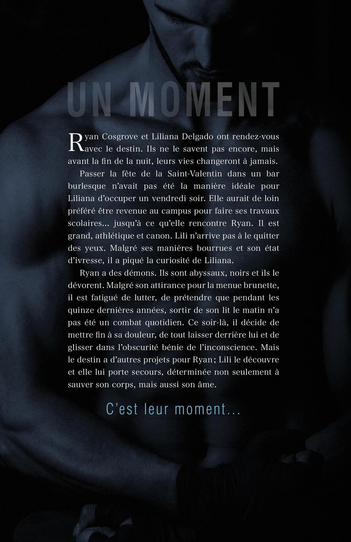 Passer la fête de la Saint-Valentin dans un bar burlesque n’avait pas été la manière idéale pour Liliana d’occuper un vendredi soir. Elle aurait de loin préféré être de retour sur le campus à faire ses travaux scolaires… jusqu’à ce qu’elle rencontre Ryan. Il est grand, athlétique et canon. Lili n’arrive pas à le quitter des yeux et malgré ses manières bourrues et son état d’ivresse ; elle est intriguée.Ryan a des démons et ils sont abyssaux, noirs, et ils le dévorent. Malgré son attirance pour la menue brunette, il est fatigué de lutter, de prétendre que pendant les dernières quinze années cela n’a pas été un combat quotidien de sortir de son lit le matin. Ce soir-là, il décide de mettre fin à sa douleur, de tout laisser derrière lui et glisser dans l’obscurité bénie de l’inconscience. Mais le destin a d‘autres projets pour Ryan; Lili le découvre et elle lui porte secours, déterminée non seulement à sauver son corps, mais aussi son âme.