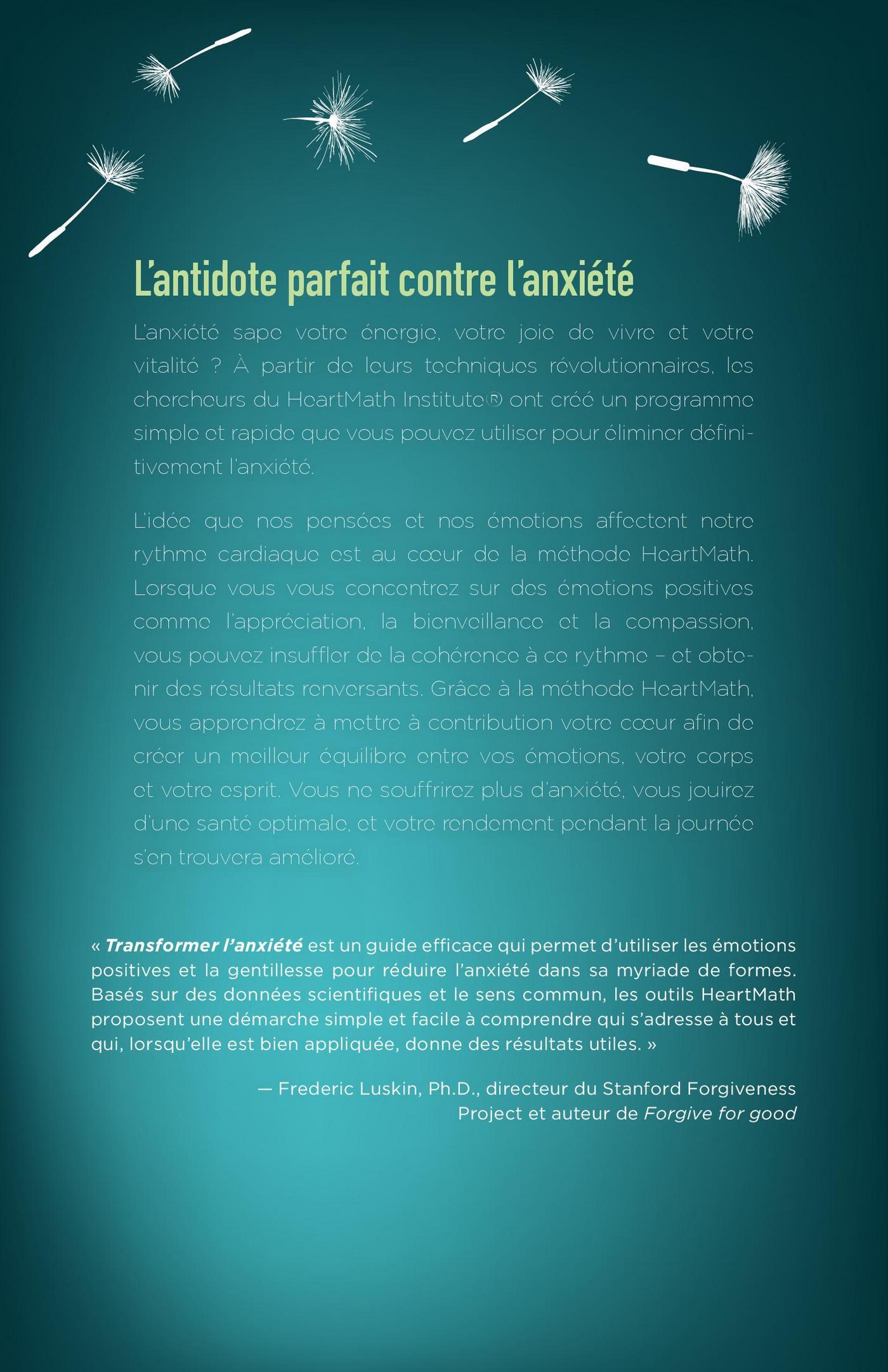 L’anxiété sape votre énergie, votre joie de vivre et votre vitalité? À partir de leurs techniques révolutionnaires, les chercheurs du HeartMath Institute® ont créé un programme simple et rapide que vous pouvez utiliser pour éliminer définitivement l’anxiété.L’idée que nos pensées et nos émotions affectent notre rythme cardiaque est au coeur de la méthode HeartMath. Lorsquevous vous concentrez sur des émotions positives comme l’appréciation, la bienveillance et la compassion, vous pouvez insuffler de la cohérence à ce rythme – et obtenir des résultats renversants. Grâce à la méthode HeartMath, vous apprendrez à mettre à contribution votre coeur afin de créer un meilleur équilibre entre vos émotions, votre corps et votre esprit. Vous ne souffrirez plus d’anxiété, vous jouirez d’une santé optimale, et votre rendement pendant la journée s’en trouvera amélioré.