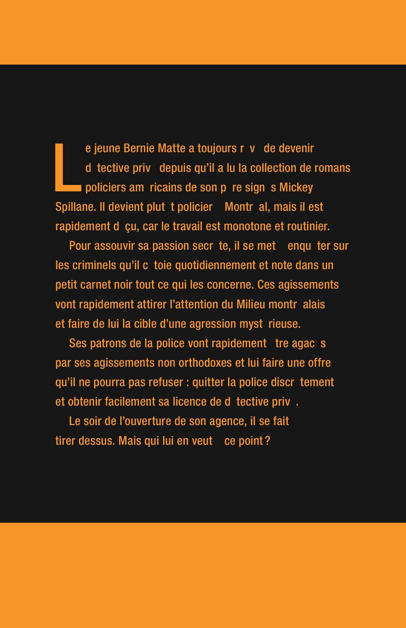 Le jeune Bernie Matte a toujours rêvé de devenir détective privé depuis qu’il a lu la collection de romans policiers américains de son père signés Mickey Spillane. Il devient plutôt policier à Montréal, mais il est rapidement déçu, car le travail est monotone et routinier. Pour assouvir sa passion secrète, il se met à enquêter sur les criminels qu’il côtoie quotidiennement et note dans un petit carnet noir tout ce qui les concerne. Ces agissements vont rapidement attirer l’attention du Milieu montréalais et faire de lui la cible d’une agression mystérieuse. Ses patrons de la police vont rapidement être agacés par ses agissements non orthodoxes et lui faire une offre qu’il ne pourra pas refuser: quitter la police discrètement et obtenir facilement sa licence de détective privé. Le soir de l’ouverture de son agence, il se fait tirer dessus. Mais qui lui en veut à ce point?
