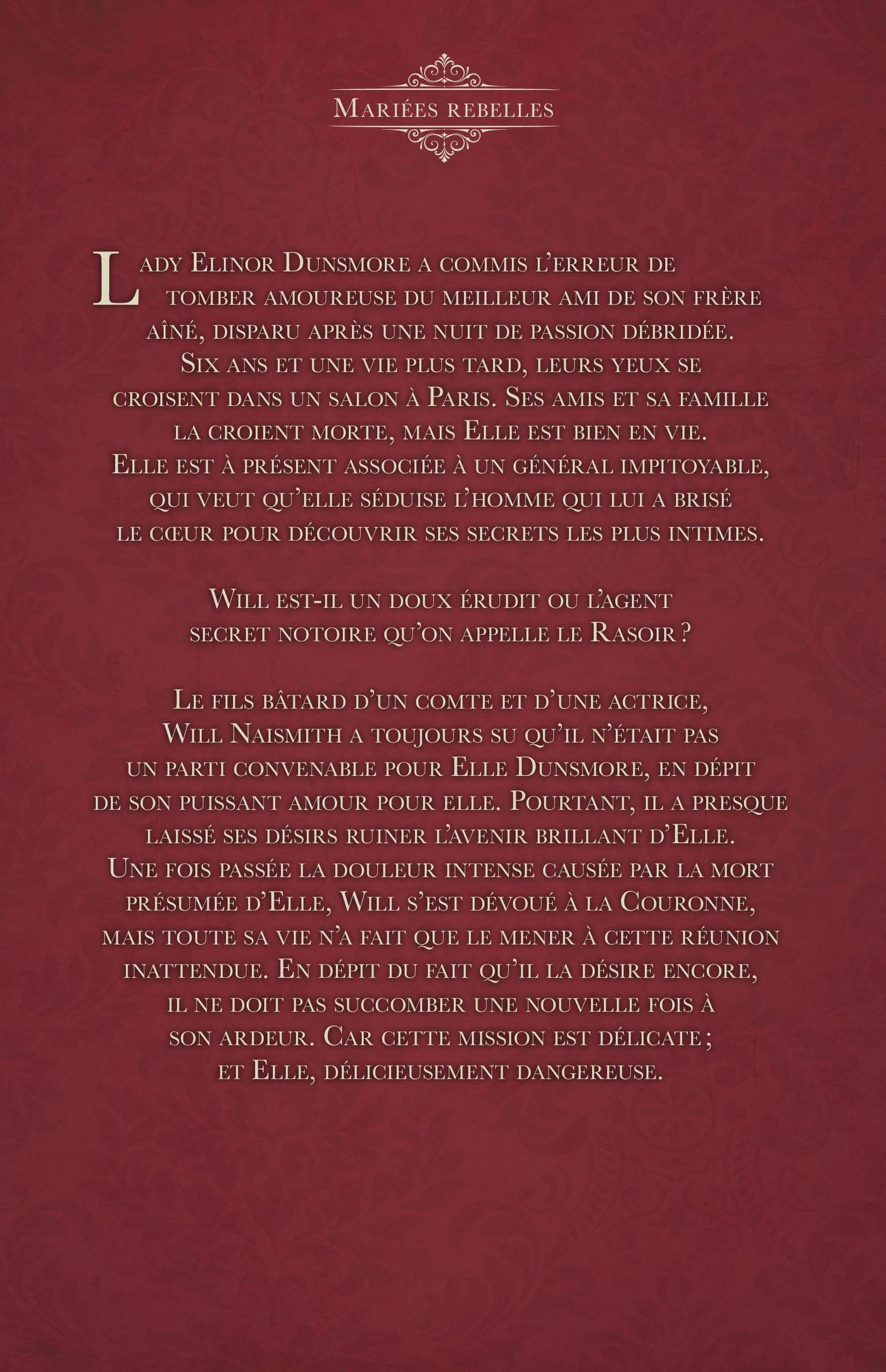 Lady Elinor Dunsmore a commis l’erreur de tomber amoureuse du meilleur ami de son frère aîné, disparu après une nuit de passion débridée. Six ans et une vie plus tard, leurs yeux se croisent dans un salon à Paris. Ses amis et sa famille la croient morte, mais Elle est bien en vie. Elle est à présent associée à un général impitoyable, qui veut qu’elle séduise l’homme qui lui a brisé le coeur pour découvrir ses secrets les plus intimes. Will est-il un doux érudit — ou l’agent secret notoire qu’on appelle le Rasoir?Le fils bâtard d’un comte et d’une actrice, Will Naismith a toujours su qu’il n’était pas un parti convenable pour Elle Dunsmore, en dépit de son puissant amour pour elle. Et pourtant, il a presque laissé ses désirs ruiner l’avenir brillant d’Elle. Une fois passée la douleur intense causée par la mort présumée d’Elle, Will s’est dévoué à la Couronne, mais toute sa vie n’a fait que le mener à cette réunion inattendue. En dépit du fait qu’il la désire encore, il ne doit pas succomber une nouvelle fois à son ardeur. Car cette mission est délicate — et Elle, délicieusement dangereuse.