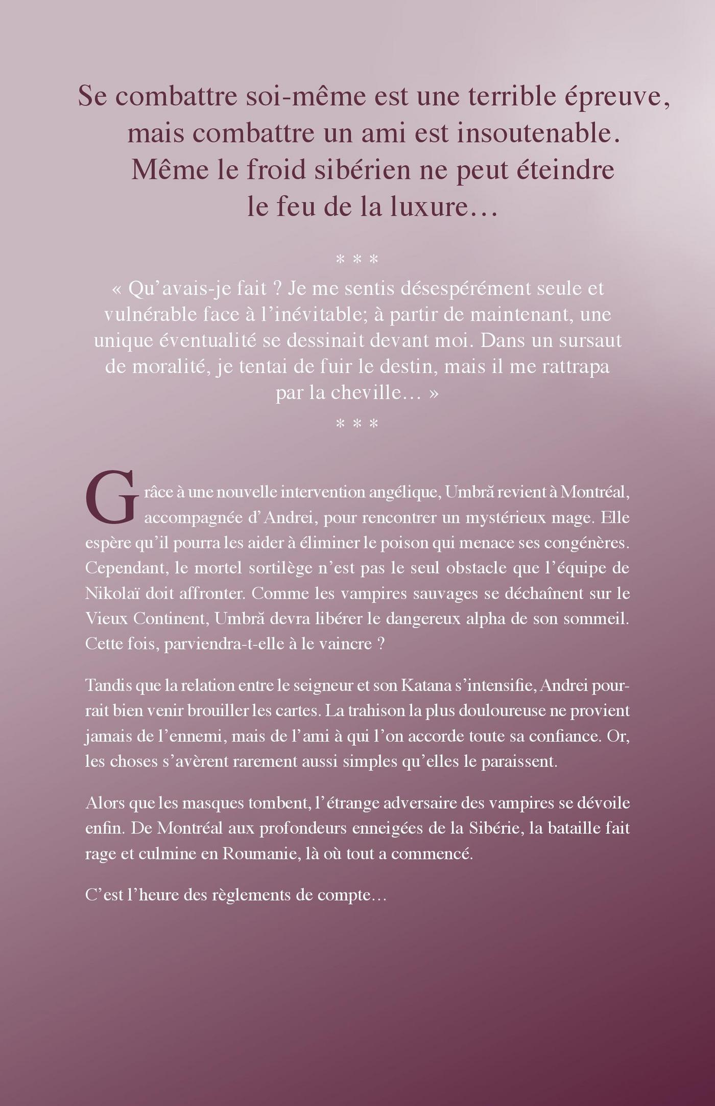 Se combattre soi-même est une terrible épreuve, mais combattre un ami est insoutenable.Même le froid sibérien ne peut éteindre le feu de la luxure…* * *«Qu’avais-je fait? Je me sentis désespérément seule et vulnérable face à l’inévitable ; à partir de maintenant, une unique éventualité se dessinait devant moi.Dans un sursaut de moralité, je tentai de fuir le destin, mais il me rattrapa par la cheville…»* * *Grâce à une nouvelle intervention angélique, Umbrã revient à Montréal, accompagnée d’Andrei, pour rencontrer un mystérieux mage. Elle espère qu’il pourra les aider à éliminer le poison qui menace ses congénères. Cependant, le mortel sortilège n’est pas le seul obstacle que l’équipe de Nikolaï doit affronter.Comme les vampires sauvages se déchaînent sur le Vieux Continent, Umbrã devra libérer le dangereux alpha de son sommeil. Cette fois, parviendra-t-elle à le vaincre?Tandis que la relation entre le seigneur et son Katana s’intensifie, Andrei pourrait bien venir brouiller les cartes.La trahison la plus douloureuse ne provient jamais de l’ennemi, mais de l’ami à qui l’on accorde toute sa confiance.Or, les choses s’avèrent rarement aussi simples qu’elles le paraissent.Alors que les masques tombent, l’étrange adversaire des vampires se dévoile enfin. De Montréal aux profondeurs enneigées de la Sibérie, la bataille fait rage et culmine en Roumanie, là où tout a commencé.C’est l’heure des règlements de compte…