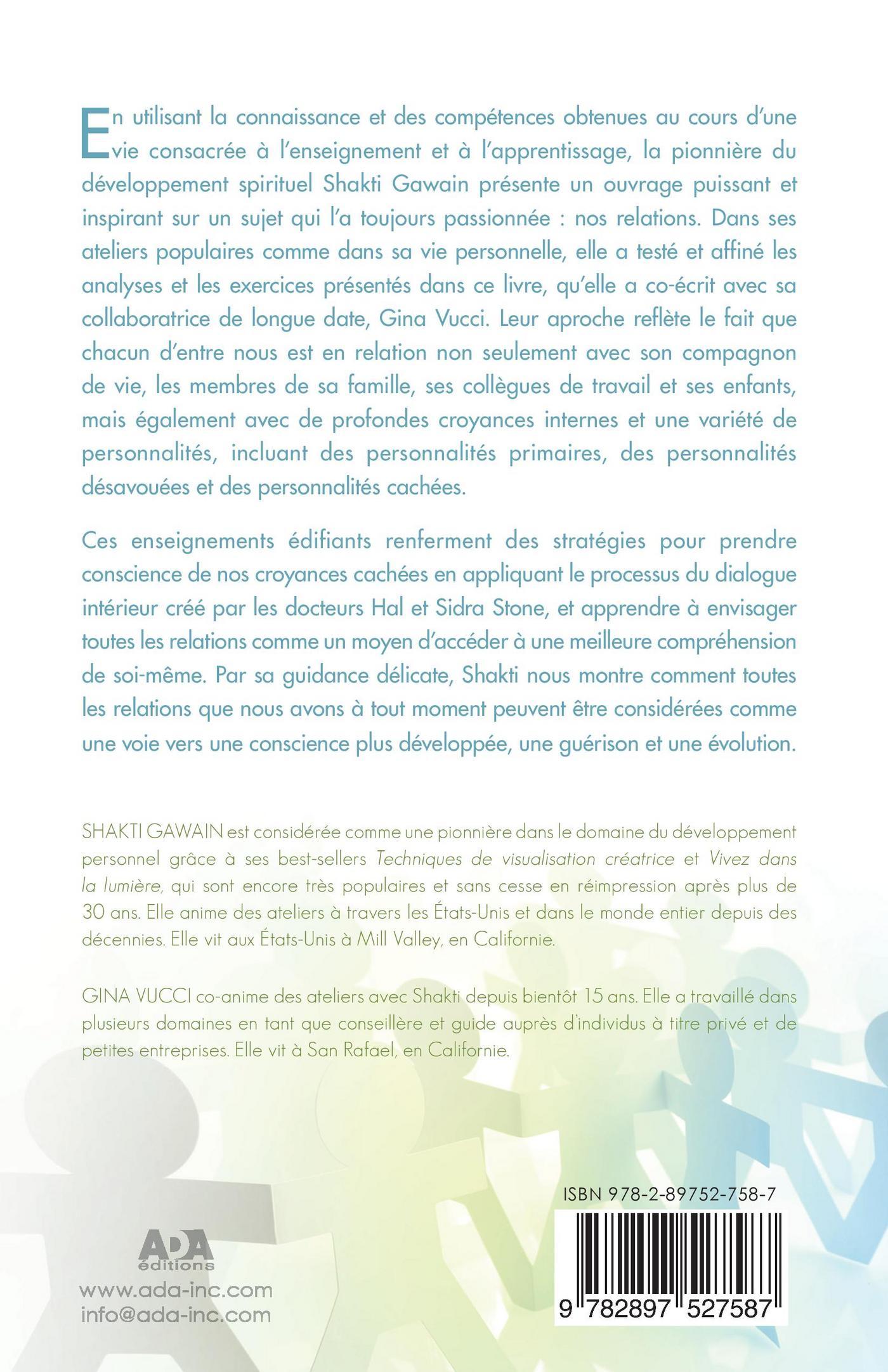 En utilisant la connaissance et des qualifications obtenues au cours d’une vie consacrée à l’enseignement et à l’apprentissage, la pionnière du développement spirituel, Shakti Gawain, présente un ouvrage puissant et inspirant sur un sujet qui l’a toujours passionnée: nos relations. Durant ses ateliers populaires comme dans sa vie personnelle, elle a testé et affiné les analyses et les exercices présentés dans ce livre, qu’elle a coécrit avec sa collaboratrice de longue date, Gina Vucci. Leur aproche reflète le fait que chacun d’entre nous est en relation non seulement avec son compagnon de vie, les membres de sa famille, ses collègues de travail et ses enfants, mais également avec des profondes croyances internes et une variété de personnalités, incluant des personnalités primaires, des personnalités désavouées et des personnalités cachées. Ces enseignements édifiants renferment des stratégies pour prendre conscience de nos croyances cachées en appliquant le processus du dialogue intérieur développé par les docteurs Hal et Sidra Stone, et apprendre à envisager toutes les relations comme un moyen d’accéder à une meilleure compréhension de soi-même. Par sa guidance délicate, Shakti nous montre comment toutes les relations que nous avons à tout moment peuvent être considérées comme une voie vers une conscience plus développée, une guérison et une évolution.