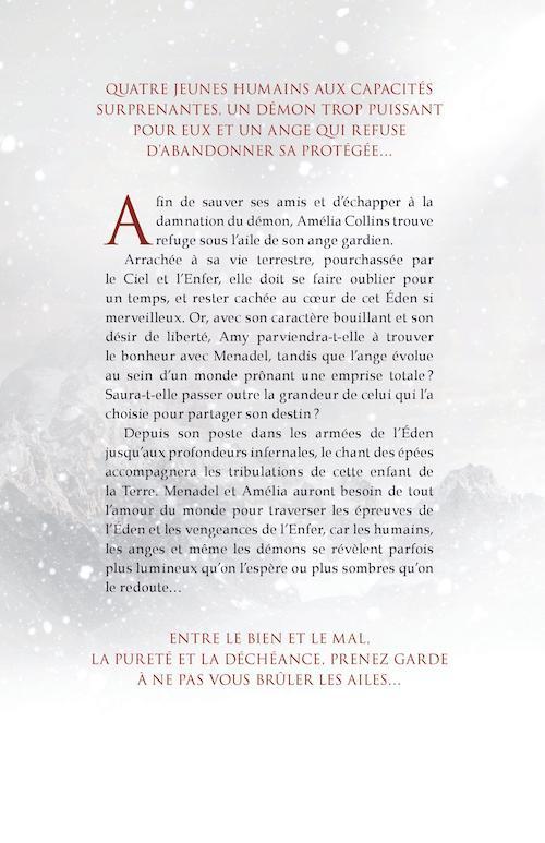 Quatre jeunes humains aux capacités surprenantes, un démon trop puissant pour eux et un ange qui refuse d’abandonner sa protégée…Afin de sauver ses amis et d’échapper à la damnation du démon, Amélia Collinstrouve refuge sous l’aile de son ange gardien.Arrachée à sa vie terrestre, pourchassée par le Ciel et l’Enfer, elle doit se faire oublier pour un temps, et rester cachée au coeur de cet Éden si merveilleux. Or, avec son caractère bouillant et son désir de liberté, Amy parviendra-t-elle à trouver le bonheur avec Menadel, tandis que l’ange évolue au sein d’un monde prônant une emprise totale? Saura-t-elle passer outre la grandeur de celui qui l’a choisie pour partager son destin?Depuis son poste dans les armées de l’Éden jusqu’aux profondeurs infernales, le chant des épées accompagnera les tribulations de cette enfant de la Terre. Menadel et Amélia auront besoin de tout l’amour du monde pour traverser les épreuves de l’Éden et les vengeances de l’Enfer, car les humains, les anges et même les démons se révèlent parfois plus lumineux qu’on l’espère ou plus sombres qu’on le redoute…