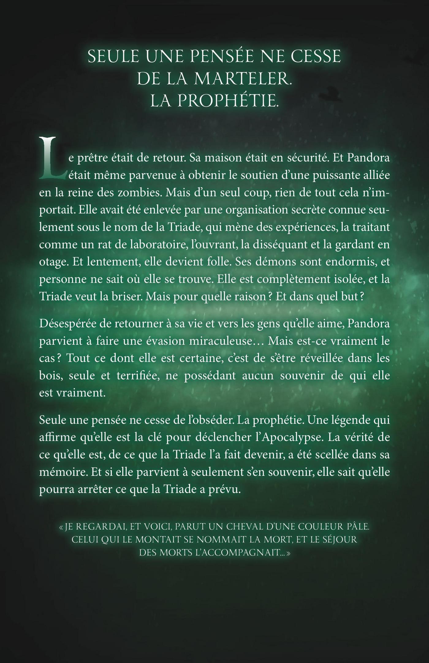 Le Prêtre était de retour. Sa maison était en sécurité. Et Pandora était même parvenueà se rallier une puissante alliée en la Reine des Zombies. Mais d’un seul coup, rien detout cela n’importait. Elle avait été enlevée par une organisation secrète seulementconnue sous le nom de la Triade qui mène des expériences, la traitant comme un rat delaboratoire : l’ouvrant, la disséquant et la gardant otage. Et lentement, elle devient folle. Ses démons sont endormis et personne ne sait où elle se trouve. Elle est complètement isolée et la Triade veut la briser. Mais pour quelle raison ? Et dans quel but?Désespérée de retourner à sa vie et vers les gens qu’elle aime, Pandora parvient à faireune évasion miraculeuse… Mais est-ce vraiment le cas ? Tout ce dont elle est certaine, c’est de s’être réveillée, seule et terrifiée, ne possédant aucun souvenir de qui elle est vraiment.Seule une pensée ne cesse de la marteler: la prophétie. Une légende qui affirme qu’elle est la clé pour déclencher l’Apocalypse. La vérité de ce qu’elle est, de ce que la Triade l’a fait devenir, a été scellée dans sa mémoire. Et si elle parvient à seulement s’en souvenir, elle sait qu’elle pourra arrêter ce que la Triade a de prévu.