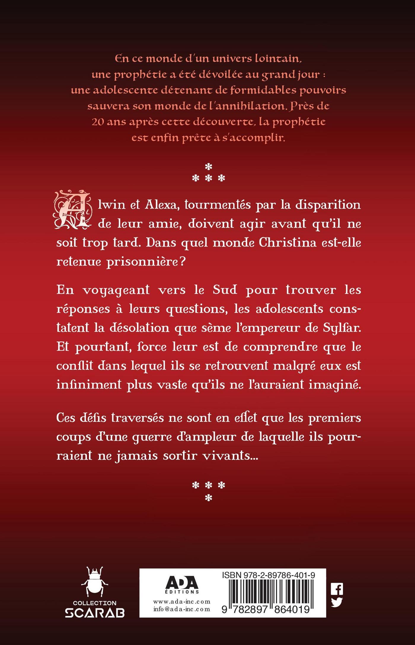 En ce monde d’un univers lointain, une prophétie a été dévoilée au grand jour: uneadolescente détenant de formidables pouvoirs sauvera son monde de l’annihilation. Près de vingt ans à la suite de cette découverte, la prophétie est enfin prête à s’accomplir.* * *Alwin et Alexa, tourmentés par la disparition de leur amie, doivent agir avant qu’il ne soit trop tard. Dans quel monde Christina est-elle retenue prisonnière?En voyageant vers le Sud pour trouver les réponses à leurs questions, les adolescents constatent la désolation que sème l’empereur de Sylfar. Et pourtant, force est de comprendre que le conflit dans lequel ils se retrouvent malgré eux est infiniment plusvaste qu’ils ne l’auraient imaginé.Ces défis traversés ne sont en effet que les premiers coups d’une guerre d’ampleur de laquelle ils pourraient ne jamais sortir vivants…
