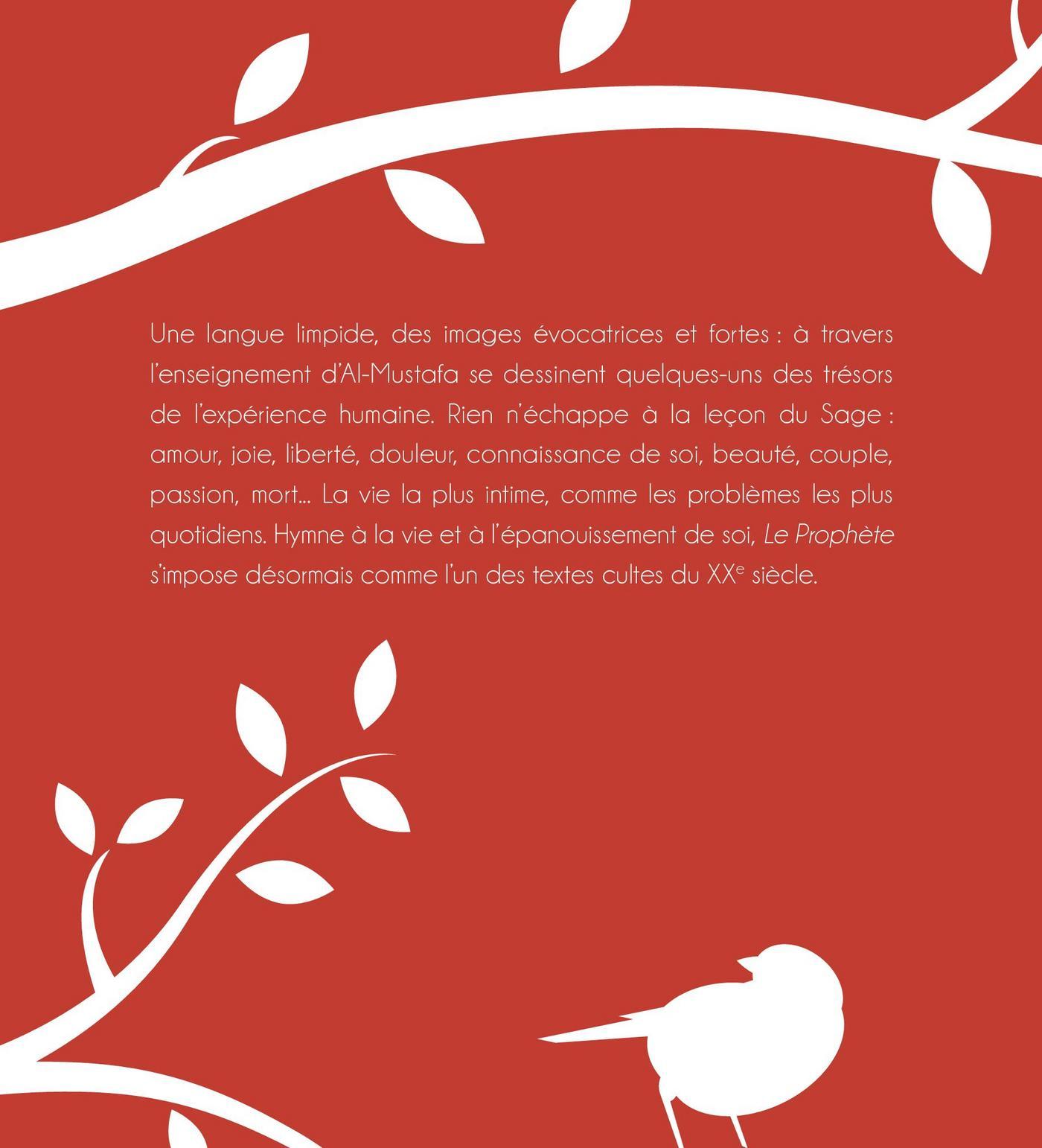 Une langue limpide, des images évocatrices et fortes : à travers l’enseignement d’Al-Mustafa se dessinent quelques-uns des trésors de l’expérience humaine. Rien n’échappe à la leçon du Sage : amour, joie, liberté, douleur, connaissance de soi, beauté, couple, passion, mort... La vie la plus intime, comme les problèmesles plus quotidiens. Hymne à la vie et à l’épanouissement de soi, Le Prophète s’impose désormais comme l’un des textes cultes du XXe siècle.