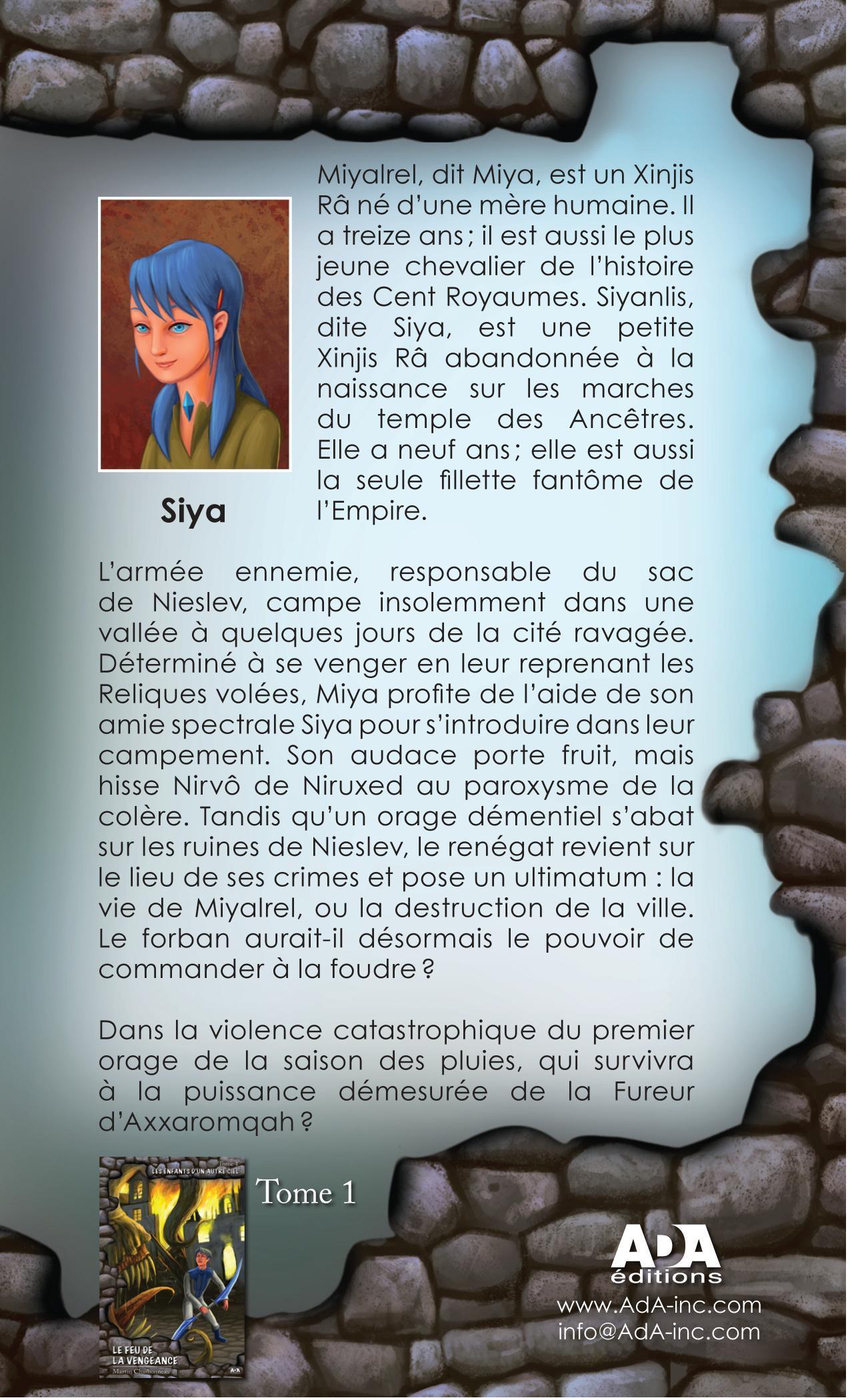Miyalrel, dit Miya, est un Xinjis Râ, né d’une mère humaine. Il a treize ans; il est aussile plus jeune chevalier de l’histoire des Cent Royaumes. Siyanlis, dite Siya, est unepetite Xinjis Râ abandonnée à la naissance sur les marches du temple des Ancêtres.Elle a neuf ans ; elle est aussi la seule fillette fantôme de l’Empire. L’armée ennemie, responsable du sac de Nieslev, campe insolemment dans une vallée à quelques jours de la cité ravagée. Déterminé à se venger en leur reprenant les Reliques volées, Miya profi te de l’aide de son amie spectrale Siya pour s’introduire dans leur campement. Son audace porte fruit, mais hisse Nirvô de Niruxed au paroxysme de la colère. Tandis qu’un orage démentiel s’abat sur les ruines de Nieslev, le renégat revient sur le lieu de ses crimes et pose un ultimatum: la vie de Miyalrel, ou la destruction de la ville. Le forban aurait-il désormais le pouvoir de commander à la foudre? Dans la violence catastrophique du premier orage de la saison des pluies, qui survivra à la puissance démesurée de la Fureur d’Axxaromqah?