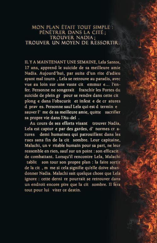 Il y a maintenant une semaine, Lela Santos, 17 ans, apprend que sa meilleure amie Nadia s’est suicidée. Aujourd’hui, à cause d’un rite d’adieu ayant mal tourné, Lela se retrouve au paradis, qui se trouve proche d’une vaste cité emmurée… l’enfer. Personnene songerait à franchir les Portes du suicide de plein gré pour se rendre dans cette cité plongée dans l’obscurité et infestée de créatures dépravées. Personne sauf Lela. Elle qui est déterminée à sauver l’âme de sa meilleure amie, même si elle y doit sacrifier sa vie.Au cours de ses efforts visant à trouver Nadia, Lela est capturée par des gardes, d’énormes créatures à demi-humaines qui patrouillent dans les rues de la cité sombre. Leur capitaine, Malachi, un véritable humain, ne leur ressemble en rien, sauf sur un point: son efficacité de combattant. Lorsqu’il rencontre Lela, Malachi établit à son tour son propre plan: la faire sortir de la cité, même si cela signifie qu’elle doit abandonner Nadia. Malachi sait quelque chose que Lela ignore: cette dernière pourrait se retrouver dans un endroit encore pire que la cité sombre. Il fera tout pour lui éviter ce destin.