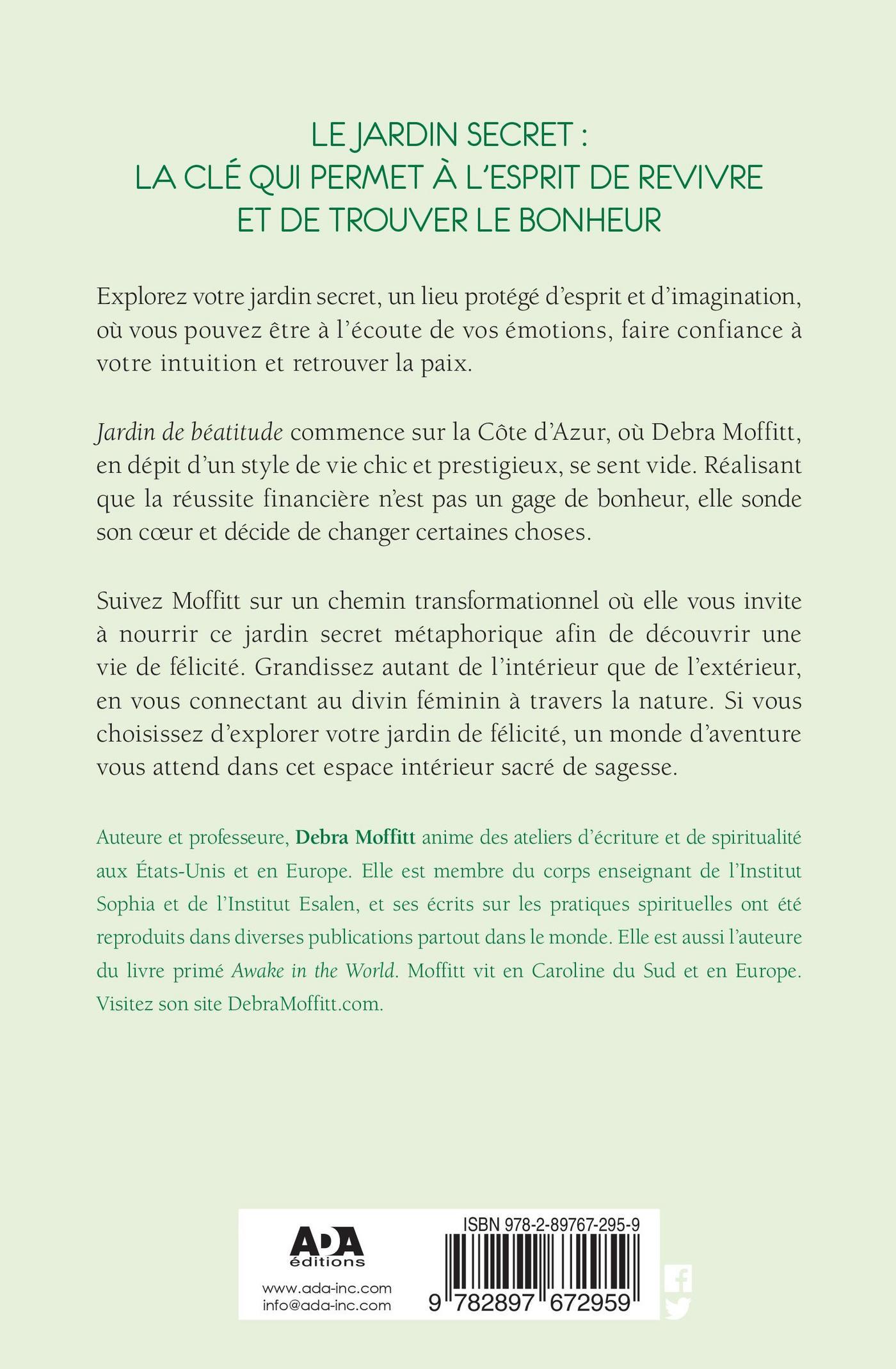 Explorez votre jardin secret, un lieu protégé d’esprit et d’imagination, où vous pouvez être à l’écoute de vos émotions, faire confiance à votre intuition et retrouver la paix. Jardin de béatitude commence sur la Côte d’Azur, où Debra Moffitt, en dépit d’un style de vie chic et prestigieux, se sent vide. Réalisant que la réussite financière n’est pas un gage de bonheur, elle sonde son coeur et décide de changer certaines choses. Suivez Moffitt sur un chemin transformationnel où elle vous invite à nourrir ce jardin secret métaphorique afin de découvrir une vie de félicité. Grandissez autant de l’intérieur que de l’extérieur, en vous connectant au divin féminin à travers la nature. Si vous choisissez d’explorer votre jardin de félicité, un monde d’aventure vous attend dans cet espace intérieur sacré de sagesse.