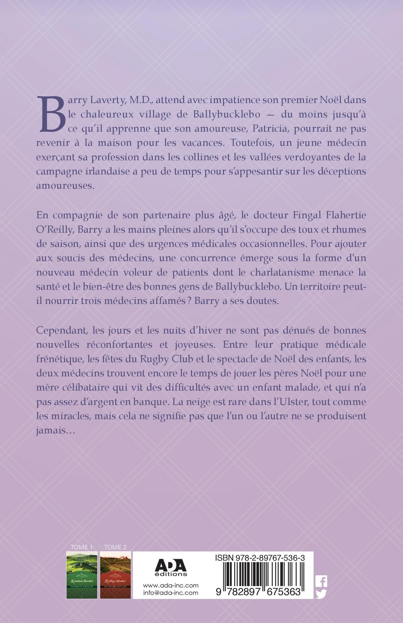 Barry Laverty, M.D., attend avec impatience son premier Noël dans le chaleureux village deBallybucklebo, du moins jusqu’à ce qu’il apprenne que son amoureuse, Patricia, pourraitne pas revenir à la maison pour les vacances. Toutefois, un jeune médecin exerçant sa profession dans les collines et les vallées verdoyantes de la campagne irlandaise a peu de temps pour s’appesantir sur les déceptions amoureuses.En compagnie de son partenaire plus âgé, le docteur Fingal Flahertie O’Reilly, Barry a les mains pleines à soigner les toux et les rhumes de saison ainsi que les urgences médicales occasionnelles. Pour ajouter aux soucis des médecins, une concurrence émerge sous la forme d’un nouveau médecin voleur de patients dont le charlatanisme menace la santé et le bien-être des bonnes gens de Ballybucklebo. Un territoire peut-il nourrir trois médecins affamés? Barry a ses doutes.Cependant, les jours et les nuits d’hiver ne sont pas dénués de bonnes nouvelles réconfortantes et joyeuses. Entre leur pratique médicale frénétique, les fêtes du Rugby Club et le spectacle de Noël des enfants, les deux médecins trouvent encore le temps de jouer les pères Noël pour une mère célibataire qui se débat avec un enfant malade et n’a pas assez d’argent en banque. La neige est rare dans l’Ulster, tout comme les miracles, mais cela ne signifie pas que l’un ou l’autre ne se produit jamais…