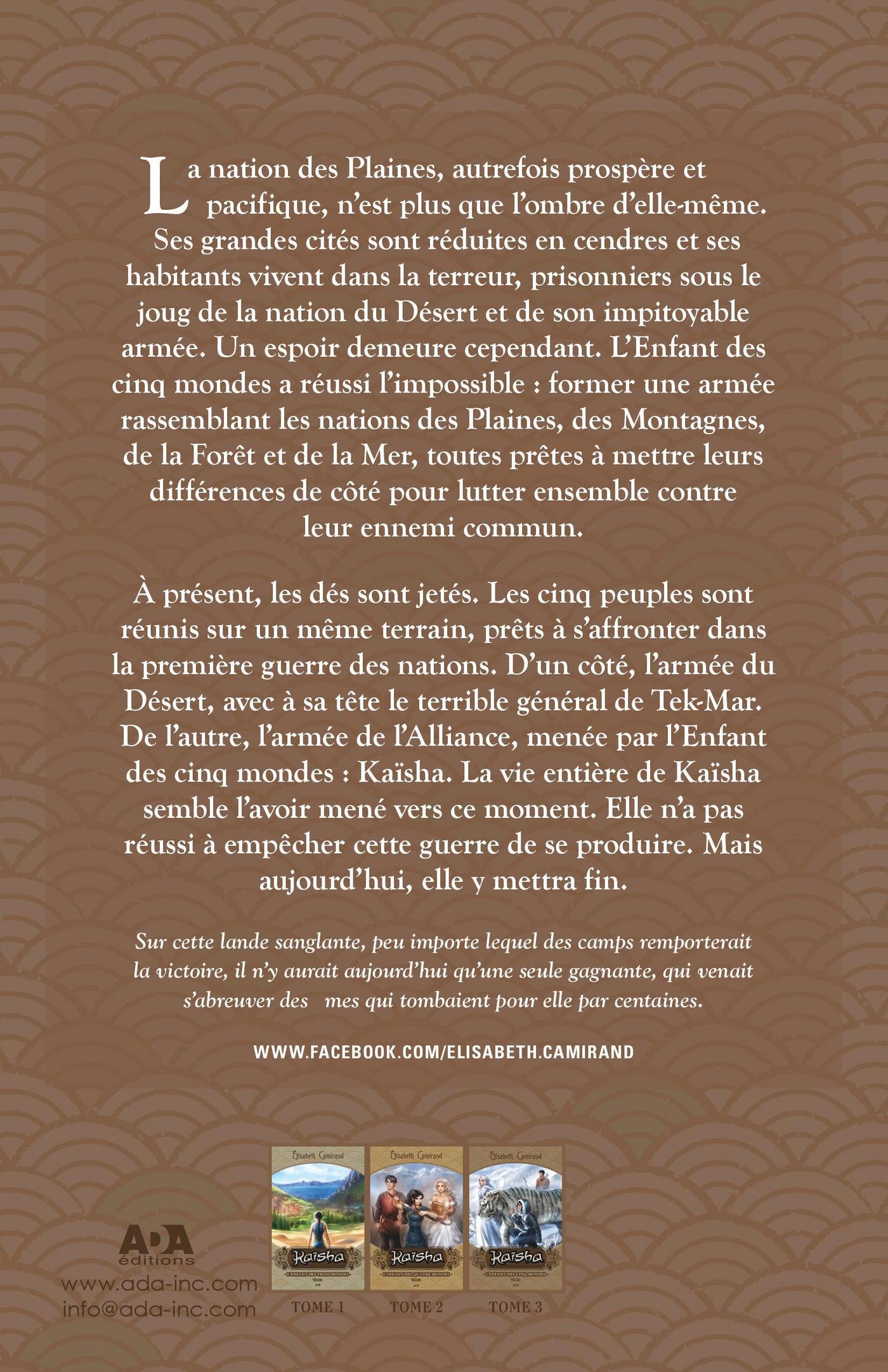 La nation des Plaines, autrefois prospère et pacifique, n’est plus que l’ombre d’elle-même. Ses grandes cités sont réduites en cendres et ses habitants vivent dans la terreur, prisonniers sous le joug de la nation du Désert et de son impitoyable armée. Un espoir demeure cependant. L’Enfant des cinq mondes a réussi l’impossible: former une armée rassemblant les nations des Plaines, des Montagnes, de la Forêt et de la Mer, toutes prêtes à mettre leurs différences de côté pour lutter ensemble contre leur ennemi commun.À présent, les dés sont jetés. Les cinq nations sont réunies sur un même terrain,prêtes à s’affronter dans la première guerre des nations. D’un côté, l’armée du Désert, avec à sa tête le terrible général de Tek-Mar. De l’autre, l’armée de l’Alliance, menée par l’Enfant des cinq mondes : Kaïsha.La vie entière de Kaïsha semblait l’avoir mené vers ce moment.Elle n’avait pas réussi à empêcher cette guerre de se produire. Mais aujourd’hui, elle allait y mettre fin.