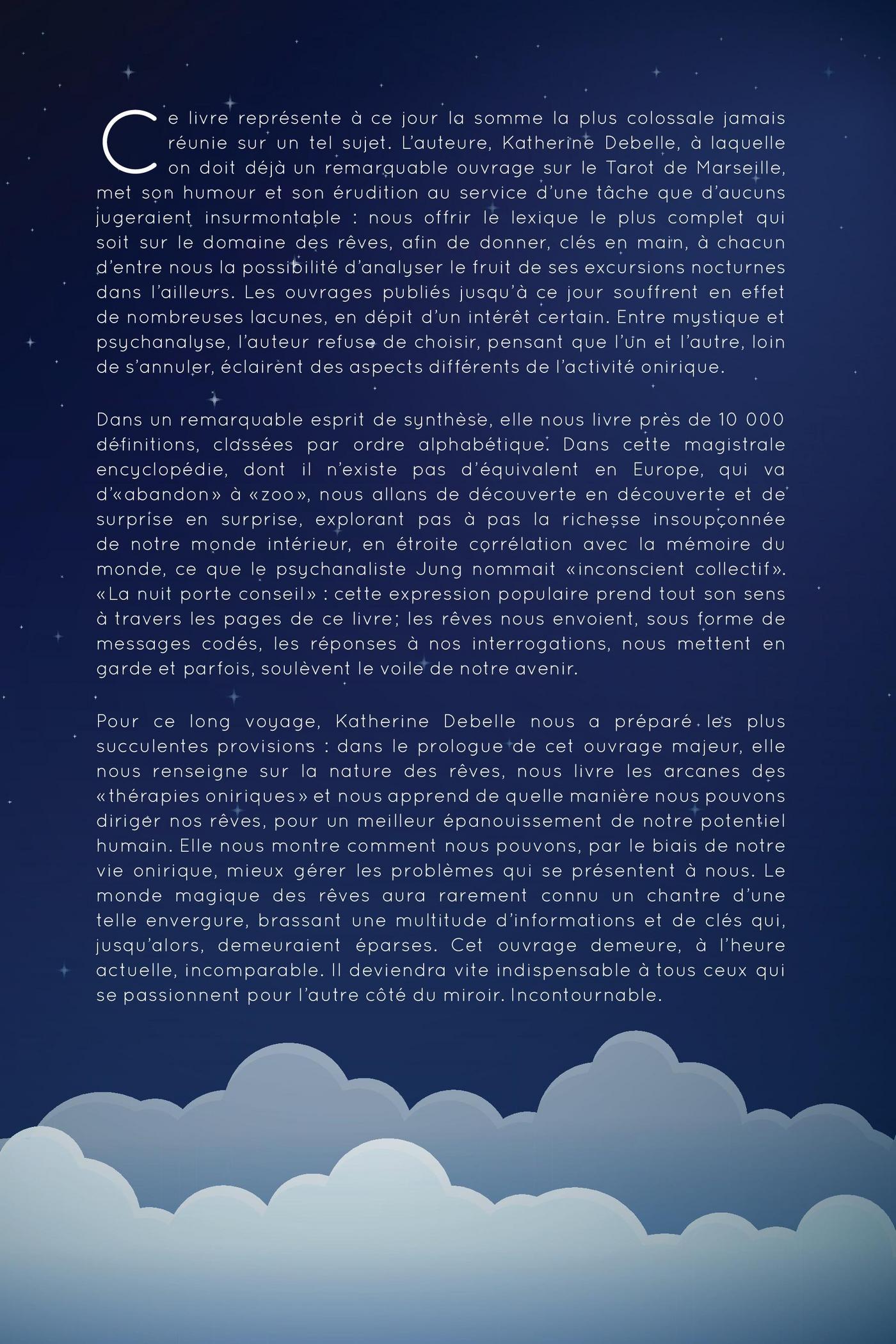 Ce livre représente à ce jour la somme la plus colossale jamais réunie sur un tel sujet. L’auteure, Katherine Debelle, à laquelle on doit déjà un remarquable ouvrage sur le Tarot de Marseille, met son humour et son érudition au service d’une tâche que d’aucuns jugeraient insurmontable: nous offrir le lexique le plus complet qui soit sur le domaine des rêves, afin de donner, clés en main, à chacun d’entre nous la possibilité d’analyser le fruit de ses excursions nocturnes dans l’ailleurs. Les ouvrages publiés jusqu’à ce jour souffrent en effet denombreuses lacunes, en dépit d’un intérêt certain. Entre mystique et psychanalyse, l’auteur refuse de choisir, pensant que l’un et l’autre, loin de s’annuler, éclairent des aspects différents de l’activité onirique.Dans un remarquable esprit de synthèse, elle nous livre près de 10000 définitions, classées par ordre alphabétique. Dans cette magistrale encyclopédie, dont il n’existe pas d’équivalent en Europe, qui va d’«abandon» à «zoo», nous allons de découverte en découverte et de surprise en surprise, explorant pas à pas la richesse insoupçonnée de notre monde intérieur, en étroite corrélation avec la mémoire du monde, ce que le psychanaliste Jung nommait «inconscient collectif». «La nuit porte conseil»: cette expression populaireprend tout son sens à travers les pages de ce livre; les rêves nous envoient, sous forme de messages codés, les réponses à nos interrogations, nous mettent en garde et parfois, soulèvent le voile de notre avenir.Pour ce long voyage, Katherine Debelle nous a préparé les plus succulentes provisions: dans le prologue de cet ouvrage majeur, elle nous renseigne sur la nature des rêves, nous livre les arcanes des «thérapies oniriques» et nous apprend de quelle manière nous pouvons diriger nos rêves, pour un meilleur épanouissement de notre potentiel humain. Elle nous montre comment nous pouvons, par le biais de notre vie onirique, mieux gérer les problèmes qui se présentent à nous. Le monde magique des rêves aura rarement connu un chantre d’une telle envergure, brassant une multitude d’informations et de clés qui, jusqu’alors, demeuraient éparses. Cet ouvrage demeure, à l’heure actuelle, incomparable. Il deviendra vite indispensable à tous ceux qui se passionnent pour l’autre côté du miroir. Incontournable.